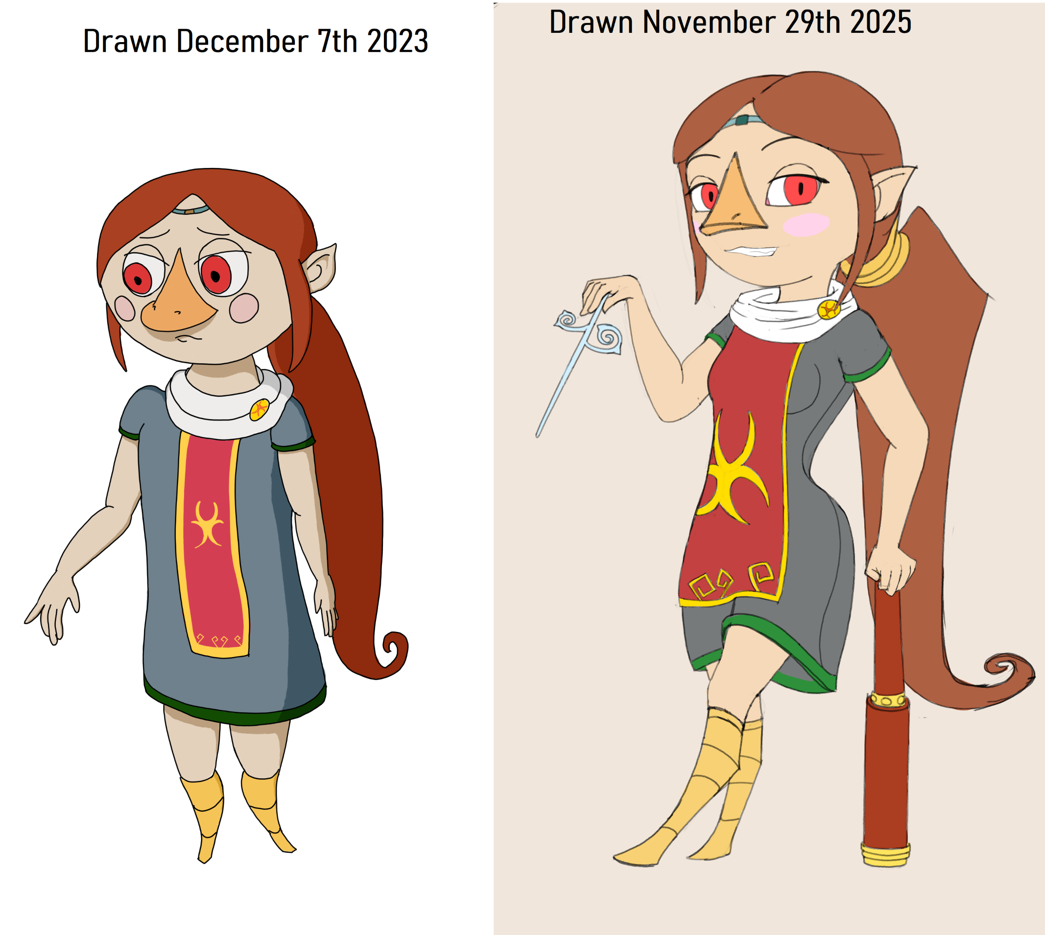 Ended up drawing this character again, and since I drew her at the end of 2023 I decided to do a side by side. The pose didn't require the use of any reference I just came up with it myself. And it's not fully done yet but I figured it was a good before and after.