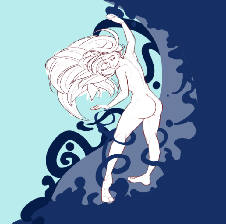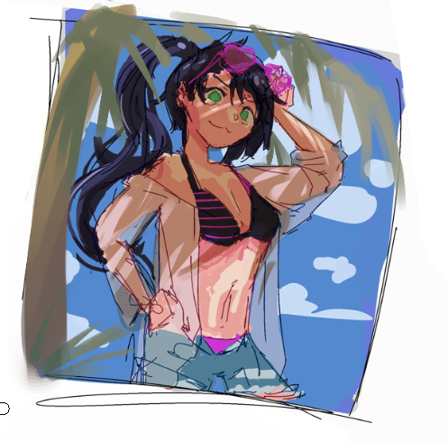 Rough draft, don't know what to do with the lighting. I want strong contrast between the lights and shadows but can't work out a good way to have that in a beach setting.>>7812635The hand holding the mask should be flipped.