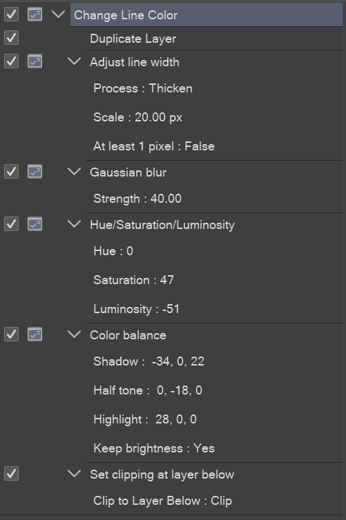 >>7812413Here are the steps the CSP auto action performs. Start with your color layer, go from top to bottom, then drag the final result so it clips to your lineart.Is this process what the artists you like use? I dunno, you'd have to ask them. Will this give you similar results? Also dunno, try it on your own drawings and see what you think. Just do it manually once to see if you like the results.