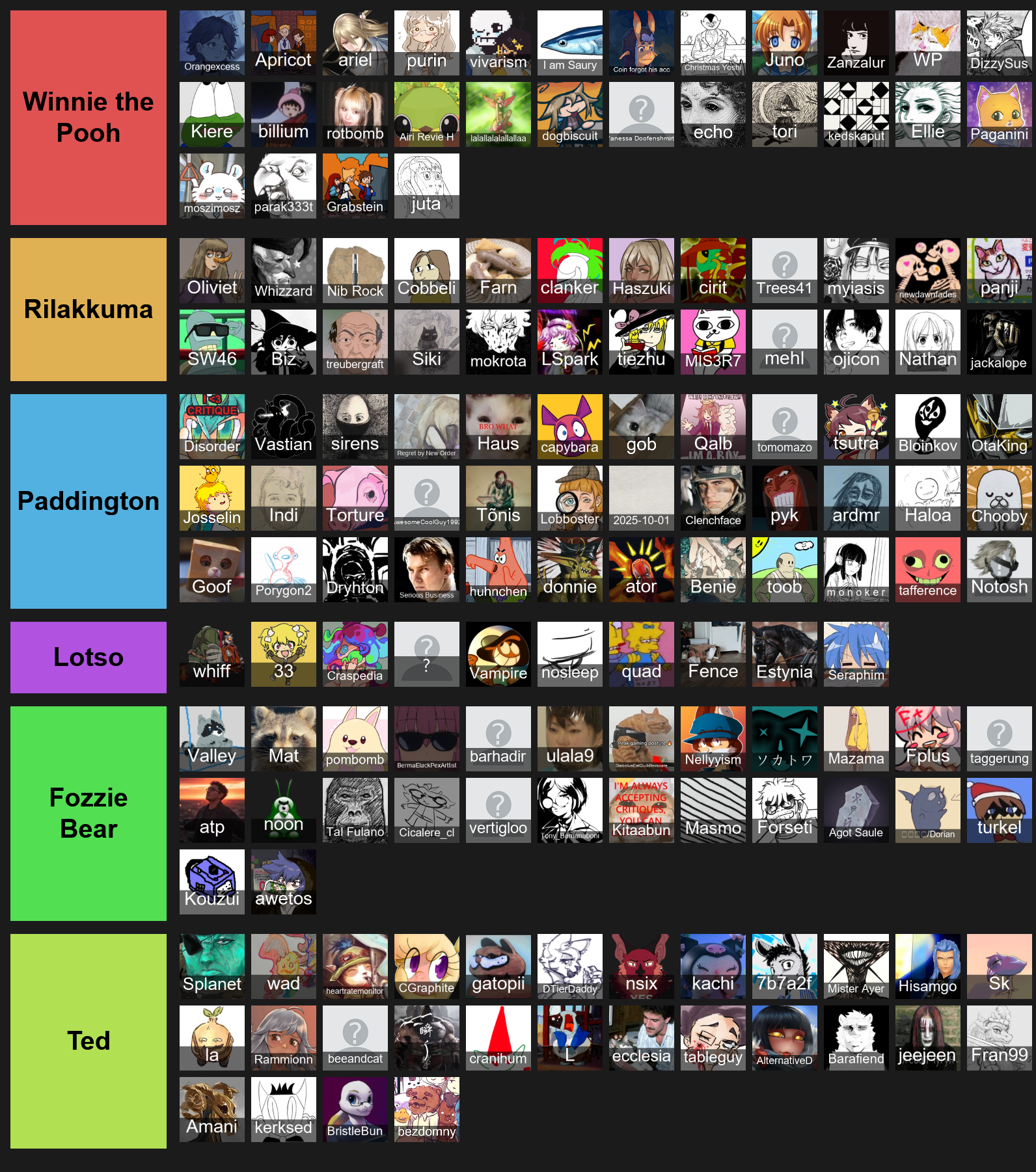 Winnie the PoohRegardless of skill, it's obvious you put your heart and soul into your work. May or may not have a carefree, whimsical aspect to their work or personality. You might be a tad bit on the naive side as well, so be careful not to let anyone take advantage of you.RilakkumaYou're just here to chill and have a good time, not really concerning yourself too much about gains. You like many kinds of types of art and people are naturally drawn to your relaxed nature. You probably like to snack or have a tasty drink while you draw. Prone to excessive napping.PaddingtonThe story of the start of your art journey is probably a bit of an unconventional one. Whatever you lack in of pure technical skill, you make up for it in sheer determination and will to improve. You're open-minded and like to connect with others. It's likely you have a trademark outfit or accessory you like to wear. Lotso Once bright eyed and bushy tailed and ready to make art, something happened to make you fall down into a cynical rabbit hole. You still continue on despite everything, but at a price. You find yourself disillusioned and bitter, but deep down lies the still sweet strawberry scent of your love for creating. Try to rediscover what makes your heart light up with joy.Fozzie Bear External validation, rather than creating for your own personal gratification is what pushes you forward. You struggle a lot, but you're always earnest in your efforts and they don't go unnoticed, even when it may feel like the opposite. You may feel lonely quite often. Try to build confidence and learn to enjoy your own company. Probably has a cool nickname or avatar.TedYou like to party and have a tainted mind. You're either in it for the money, or the promise of making your deepest fantasies a reality. You're not afraid of the grind as long as it gets you where you want to be, but you can be easily thrown off track. Despite your vices, you have a good heart when it comes to your friends.