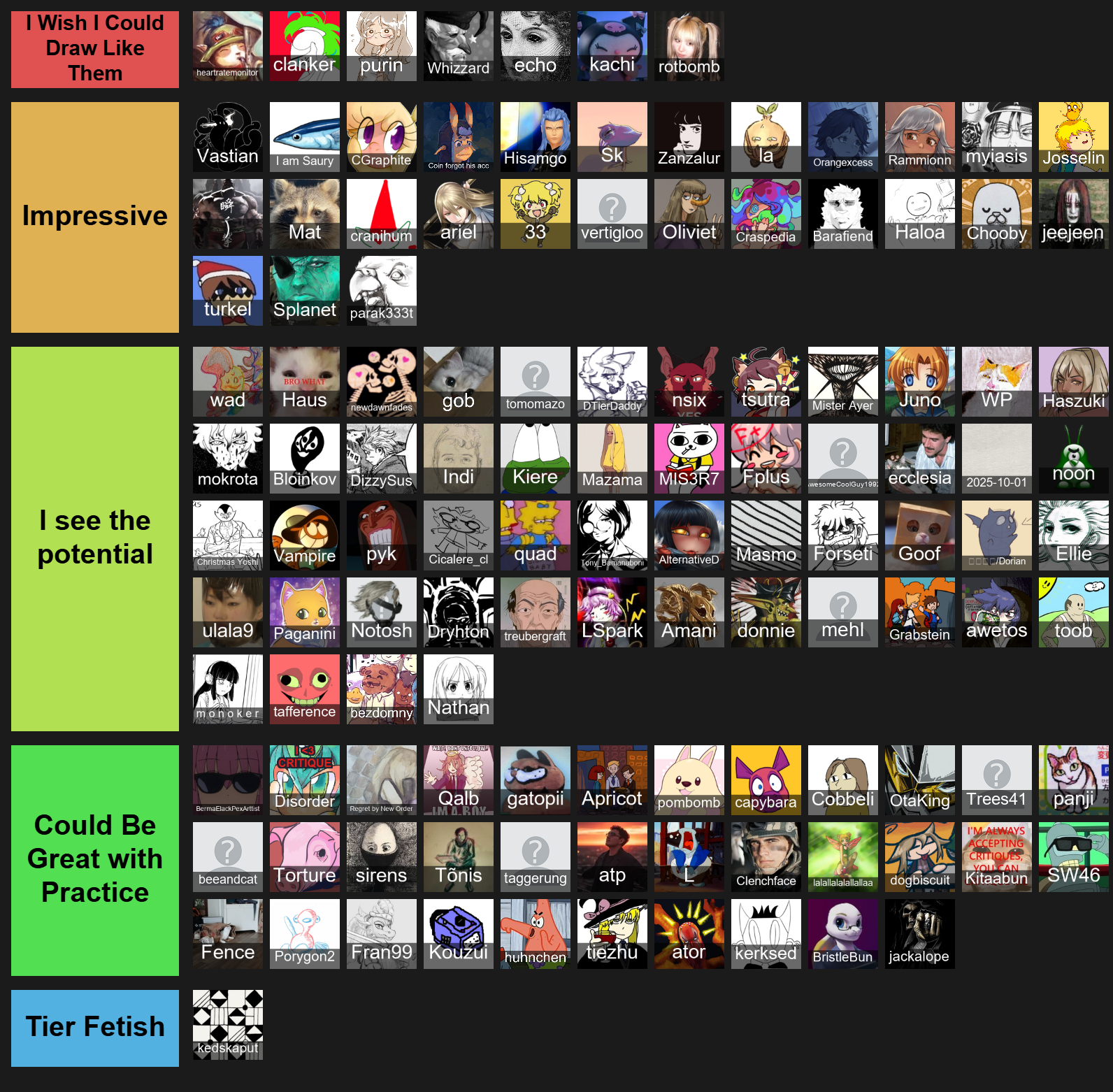 i updated the tierlist. i'm too busy making AAA video games to be drawing every day at the moment. i'm gunna see if i can find time to make it entirely automated and scheduled.