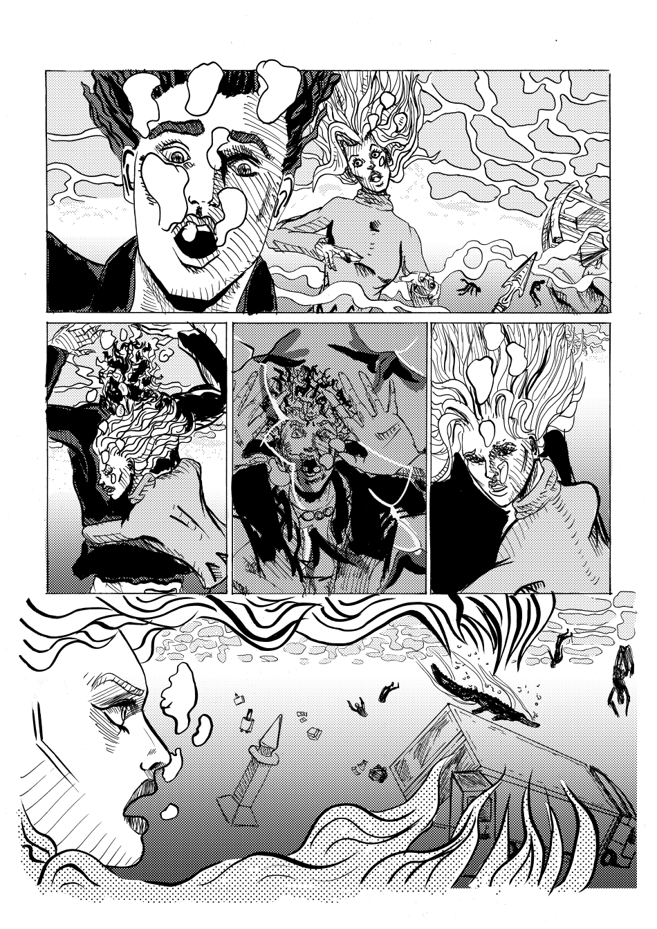 Just started toning, like 20 pages Ive stocked up, anybody got any tips on making scenes look underwater? I've mainly been using this as reference https://mangadex.org/chapter/6e0d3f21-a164-440a-aa1a-df6a1302ff38/26 (ive got the monochrome version)this is the start of a scene taking place underwater, in this realm between the waves, where the governments lazily thrown a bunch of bodies, and useless magical artifacts into. Ill probably add more details to this page, darkness underneath, and wave currents, but tell me what else I should add to make it look better + more obvious its underwater.