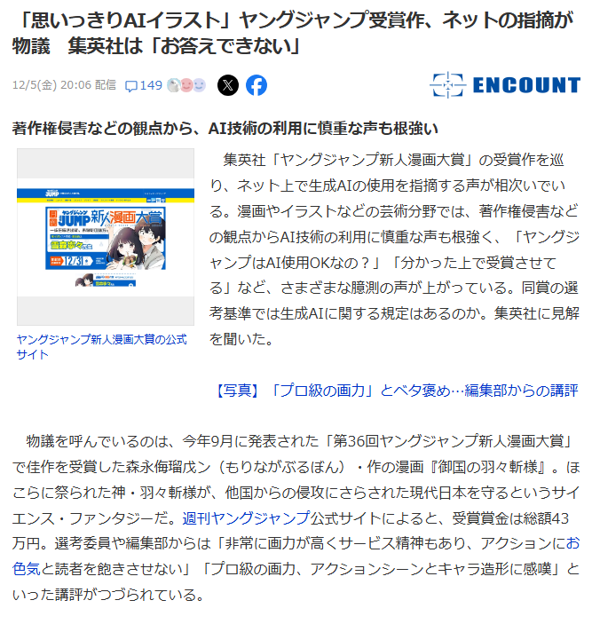 https://news.yahoo.co.jp/articles/e16b6bd004bb3e6eefb6c93e12a0f83d10b12>"AI Illustrations" Young Jump Award-winning work sparks controversy online; Shueisha says "We cannot answer"It's over.Forget your dream to be published in Jump. This magazine and its company embrace AI and it will utilize it for their profit. I bet they will use AI to continue milking One Piece once Oda's dead.