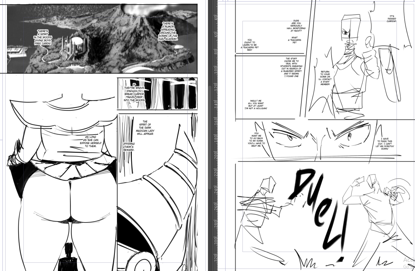 >>7818486I'm making a yugioh gx doujin where the male goes to a spot to get teased by one of the teachers, not knowing its her and then finds out after. He takes multiple trips to this spot and then they return for one more real encounter after her disguise is blown. It's fan art of a shy character so It was hard for me to imagine it happening faster. I'm also so autistically attached to making it feel authentic that it includes a duel (that is cut away from)My point is that I'm kind of doing what you suggested, It's just shown and not implied.>>7818562canon material right here
