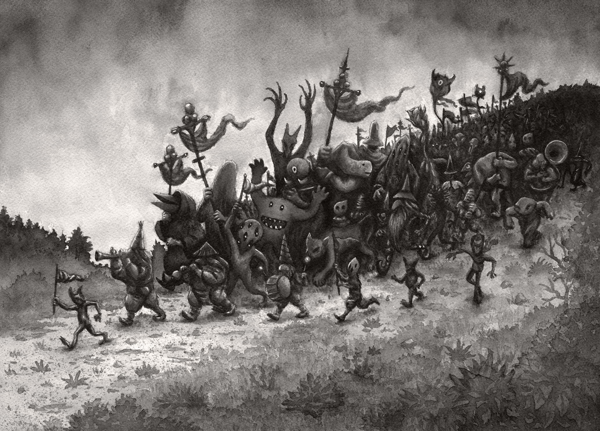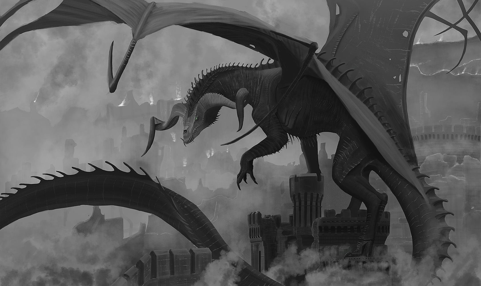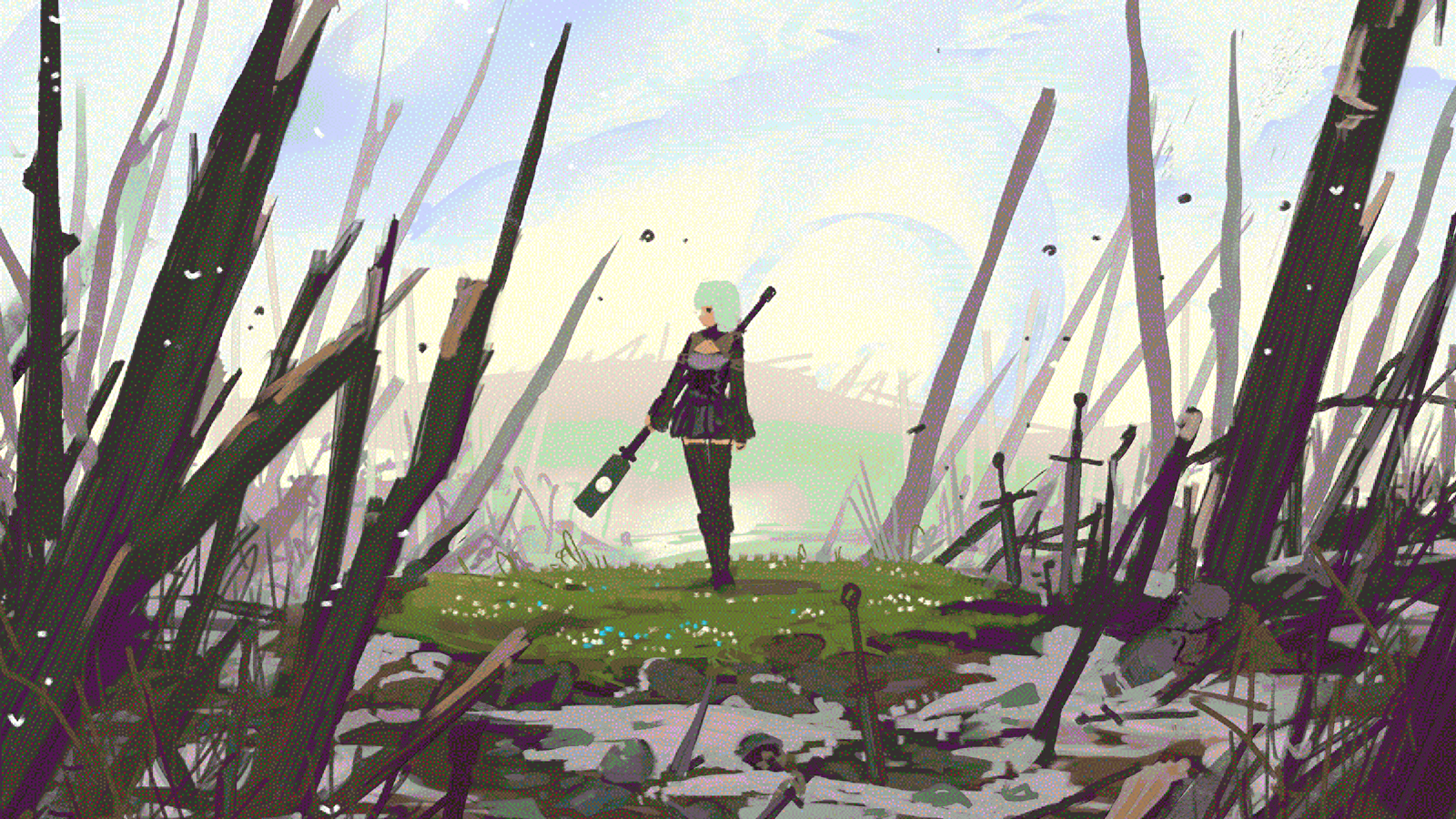I was thinking that the background be an abandoned ruin of a fortress or something like that.