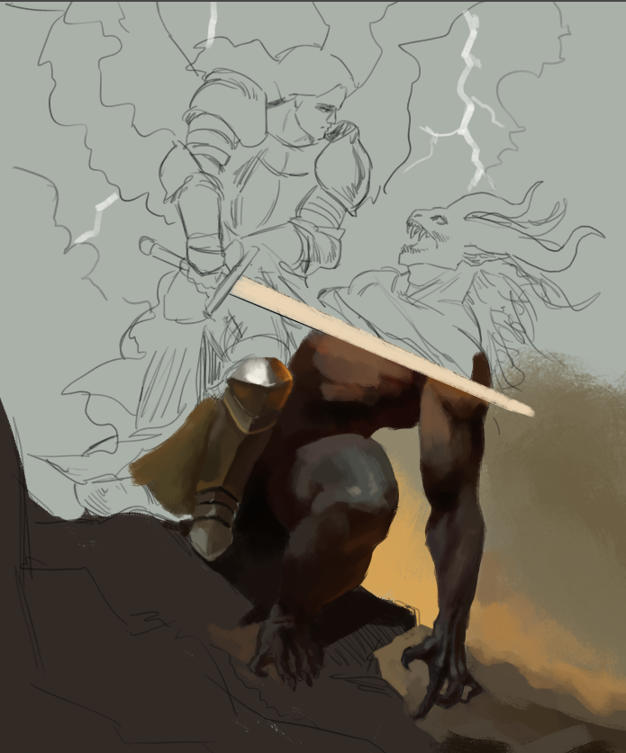 It seems good as a starting point to a more finished piece, although being honest I don't find the situation or place that interesting at the moment. Maybe consider using some of the BG to the right as a place for resting the eye, normally using a clean sky would be a decent starting point, but for the tone of your scene (I'm thinking combat, danger, or skirmish) you could use some darker tones, maybe some smoke to imply there's a battle happening around them.