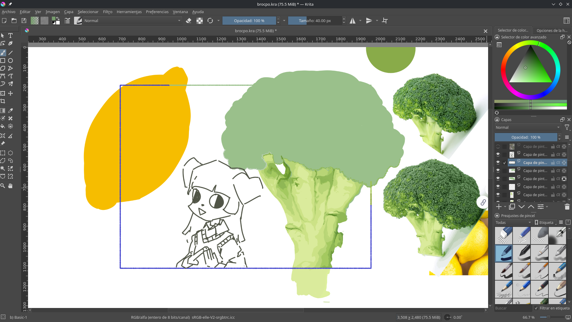 It's my first time drawing without lineart. I think the broccoli stem looks good, but now I have to make the top part, but I don't know how. I had thought about making a flower (?) at the same time, but surely there must be a better and faster way.
