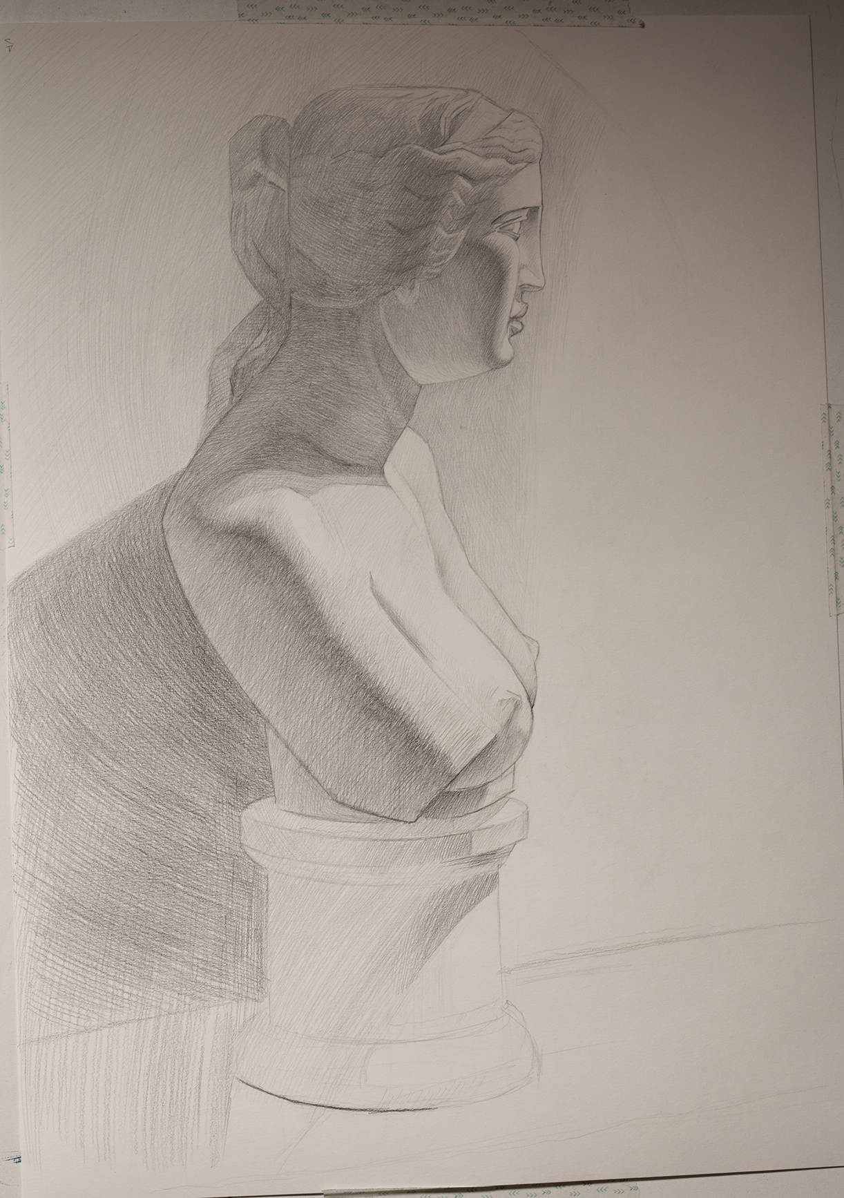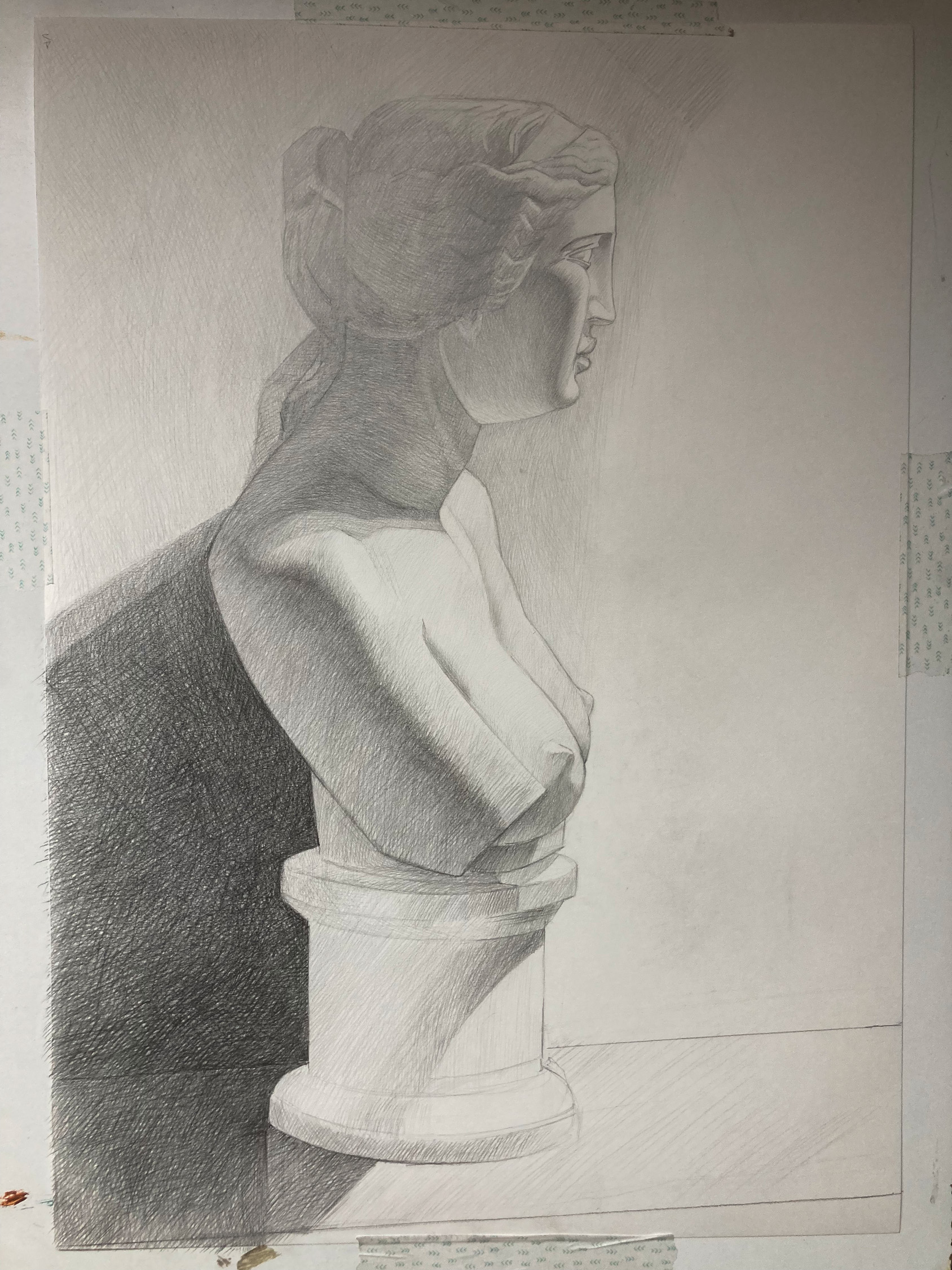 Started another graphite study.I figured out, in French Academia people used conte pencil, charoal and the stamp. Hatching a a3 paper with a fine point feels like autism, desu.