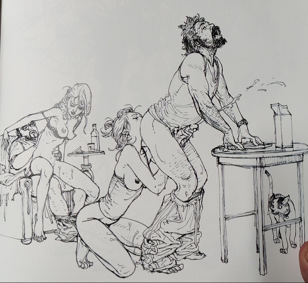 >>7849466Apparently when his kids wanted to draw he'd just hand them his sketchbook and they'd doodle on whatever page was available. Imagine being a kid and seeing your dad's drawing of a pig man fucking a hooker up the ass.