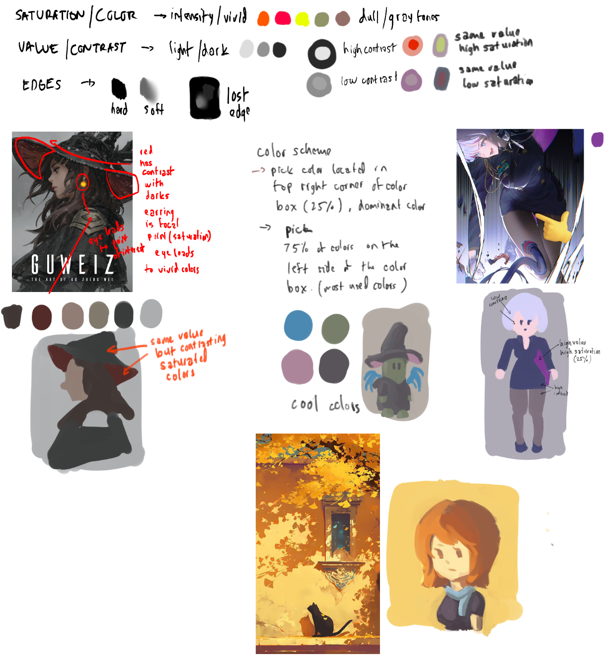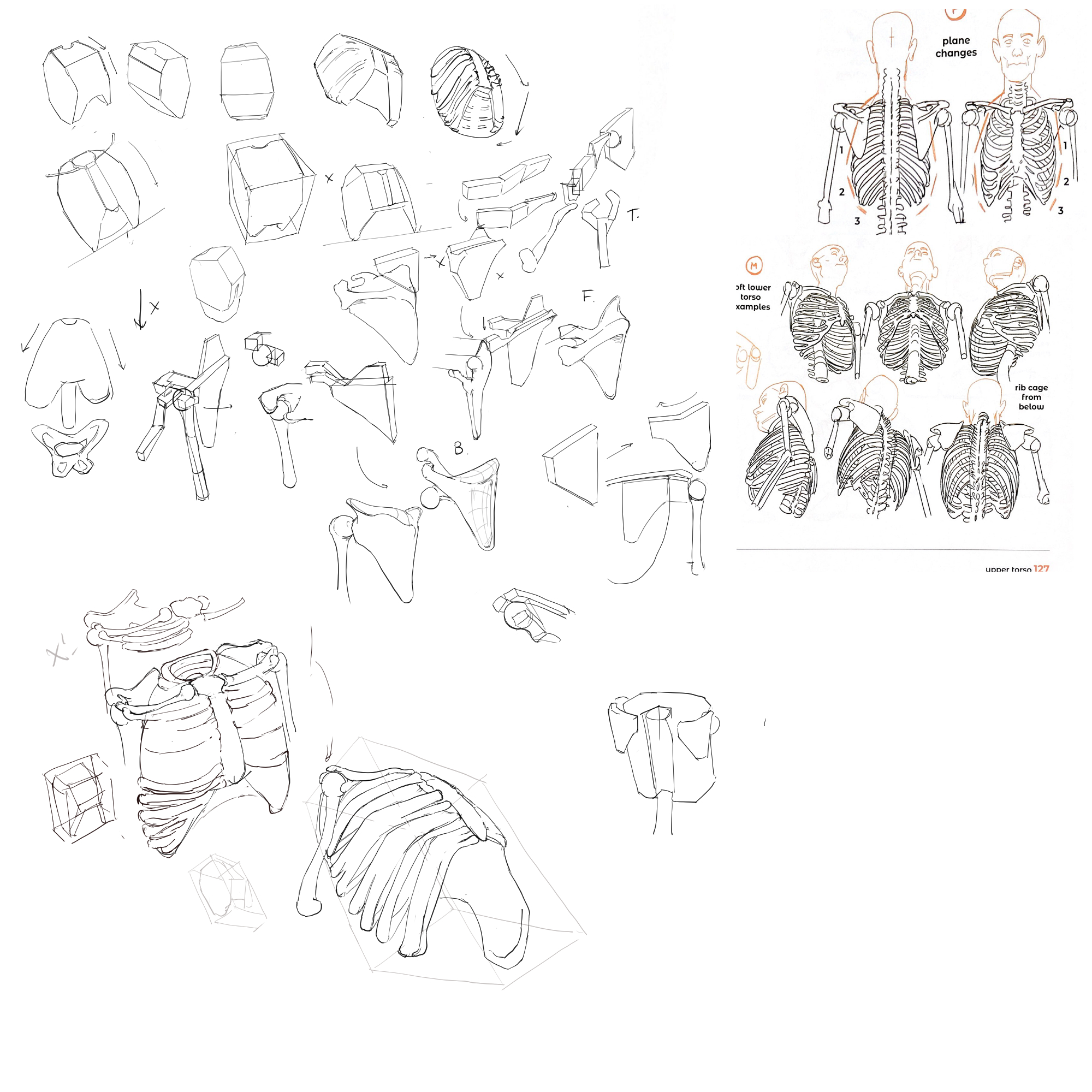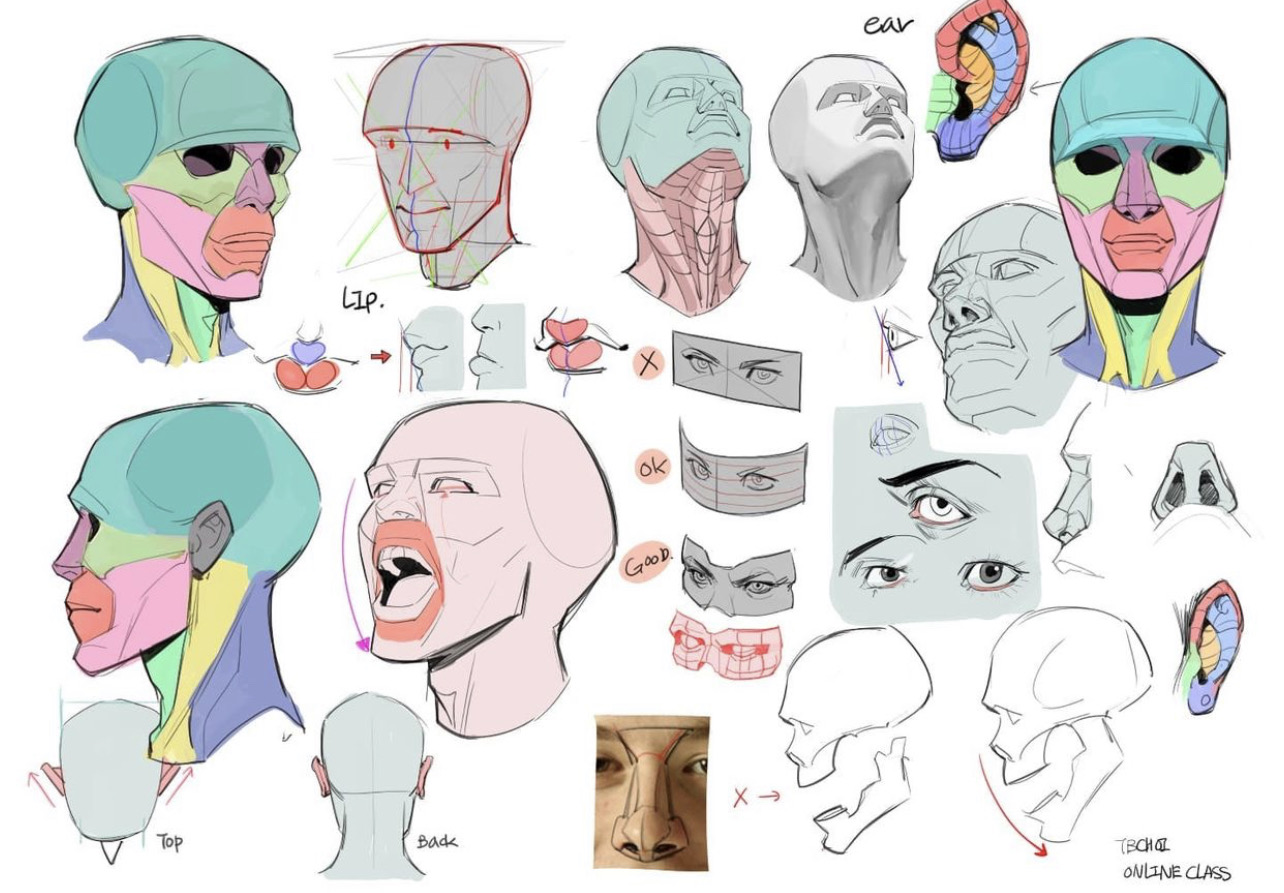 >>7849996Learning to draw is mostly two things:Training your eyes (seeing proportion, angles, value, edges)Training your hands (making clean, confident marks that match what you see/plan)If you build a routine that hits both every week, you’ll improve fast.The core loop (works for any style)Observe Simplify Construct Check CorrectObserve: measure angles, negative shapes, big value masses.Simplify: reduce to big shapes (blob, box, cylinder)Construct: build forms in 3D (planes, cross-contours).Check: compare against reference (plumb lines, relative lengths).Correct: redraw the same thing once or twice. The second pass is where growth happens.What to practice (the “skill tree”)1) Line + shapes (control)Goal: your lines go where you intend.Ghost your stroke (hover commit).Do pages of: straight lines, ellipses in boxes, curves, simple shapes.2) Forms in 3D (the real foundation)Goal: you can rotate boxes/cylinders mentally.Boxes in perspective (lots).Cylinders through boxes.Simple “toy” objects (mug, shoe, stapler) built from primitives.3) Perspective (so things don’t look “off”)Goal: believable space.1-point room corners, then 2-point boxes, then inclined planes.Draw from life: your desk setup, hallway, chair.4) Value (makes drawings look real)Goal: light reads clearly.Do small grayscale studies (5 values max).Practice cast shadows and turning form (sphere/cylinder/box).5) Gesture + anatomy (if you like people/characters)Goal: movement + proportion.30–90s gestures (lots), then 5–10 min “structure” passes.Learn big landmarks first (ribcage, pelvis, spine, knees/elbows).6) Composition + design (if you want concept art)