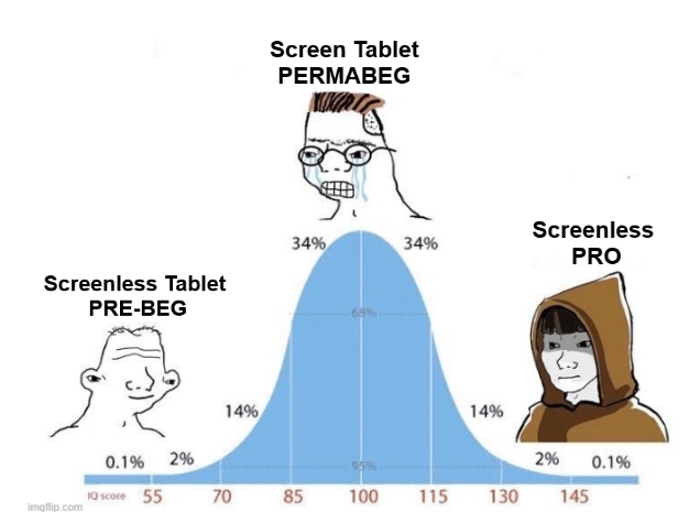 >>7850189I can personally vouch for screenless tablets but I think I've been using small ones for nearly 2 decades. Don't quote me on that though; I was a moronic tween when I got my first one, but it was definitely in the early 2000's. Posture's great, never had wrist pain, and modern tablets don't chew through nibs like they used to. Started with something before the Bamboo, but that was my baby back in the day."Bitch tax" is a cope; I only hear complaints about screen tablet users, mainly their posture and pain. "Shrimp tax" is more accurate.