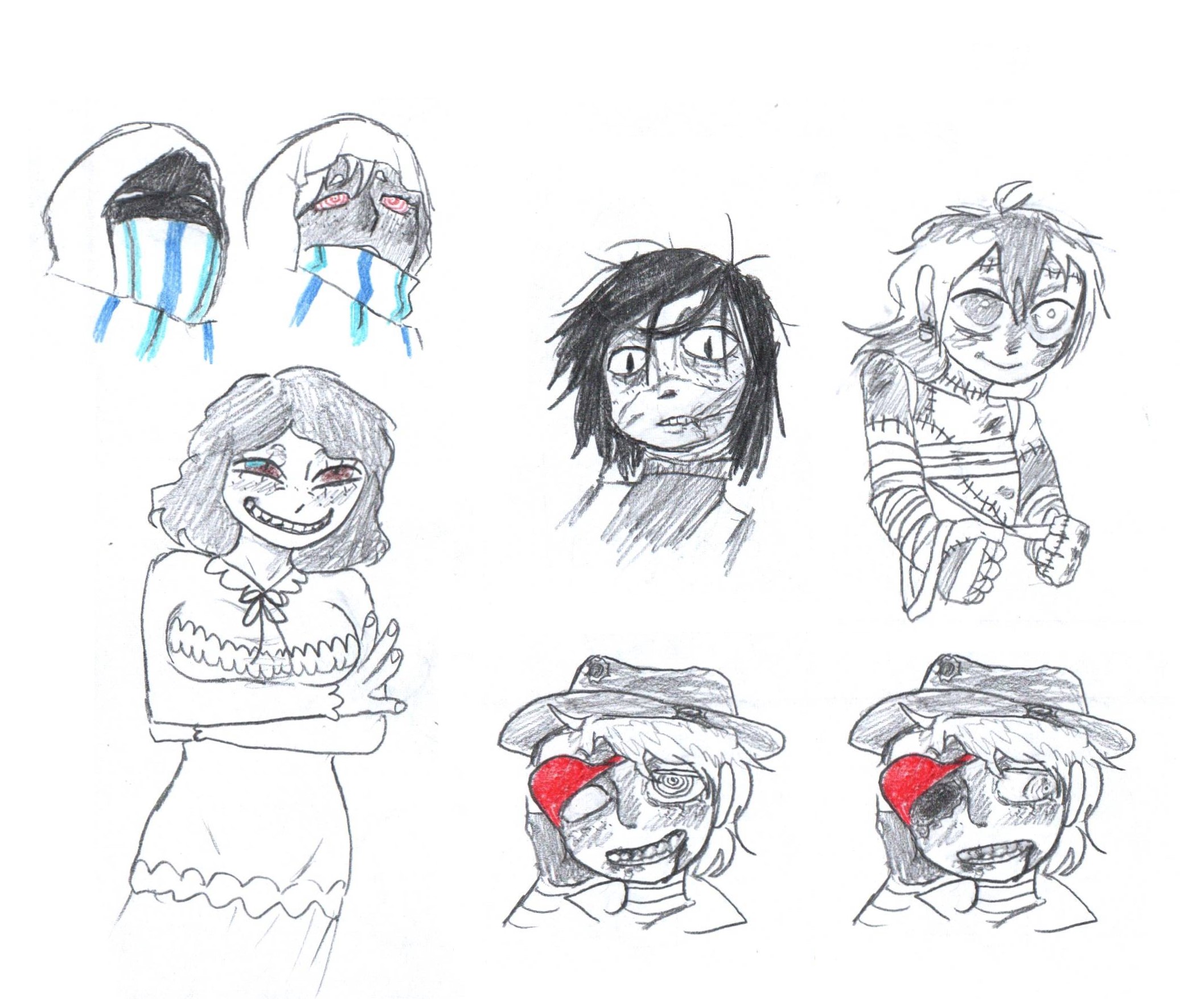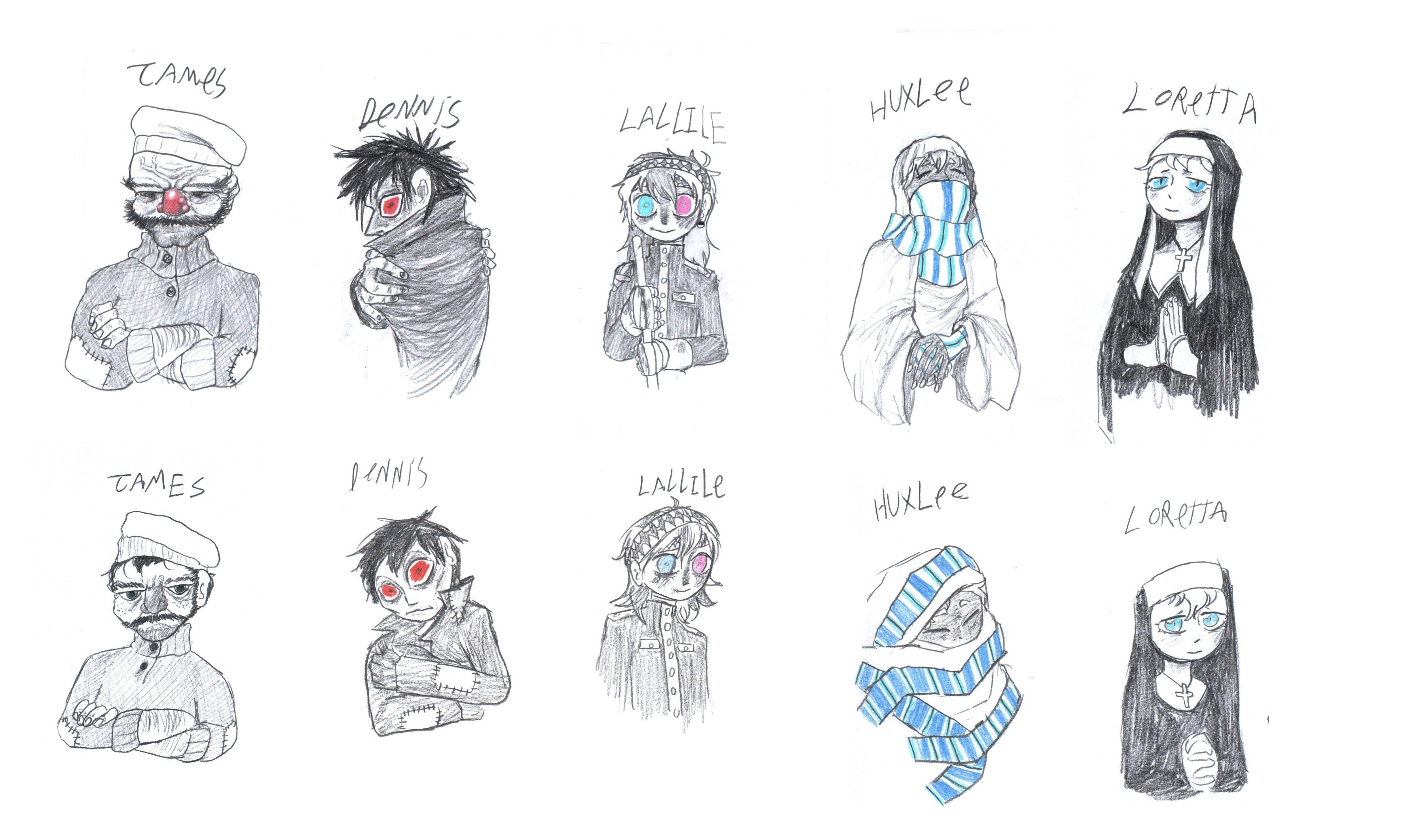 >>7849222I think you cut off the demon eye head guy off to much drawing wise. Just draw a small indication of a bed to make it a complete portrait.For the Loretta one her head piece should have a little bit more of that black fabric thats supposed to droop down on top.Like even the most exaggerated ones I can find on like a google search still have that little sliver of fabric. Like if you made the line on the top of the headpiece just thick it would look better.Huxlpe(the blue scarf one) again I feel is just cut off to early. Assuming that what shes wearing is some form of hijab just indicate a shoulder, otherwise she just looks like a curled up ball. It doesnt need much just like a shoulder line.Lallile and Dennis are fine design wise but I think their drawings are the weakest compared to everyone else, even the ones I complained about are stronger drawings compared to those two characters despite my nitpicks. Dennis looks like a guy with a hunch , like when I looked at him I though of Igor from the Persona series cause it looks like your going for that kind of pose, but there are other hunched characters you can look at.And just have Lallile face forward towards the viewer, he doesnt have to do anything special but it be more in line with the rest of the art(Johnny and Ruthie I see as an exception cause they are so close to each other, seems intentional)This is a good track to be on though OP