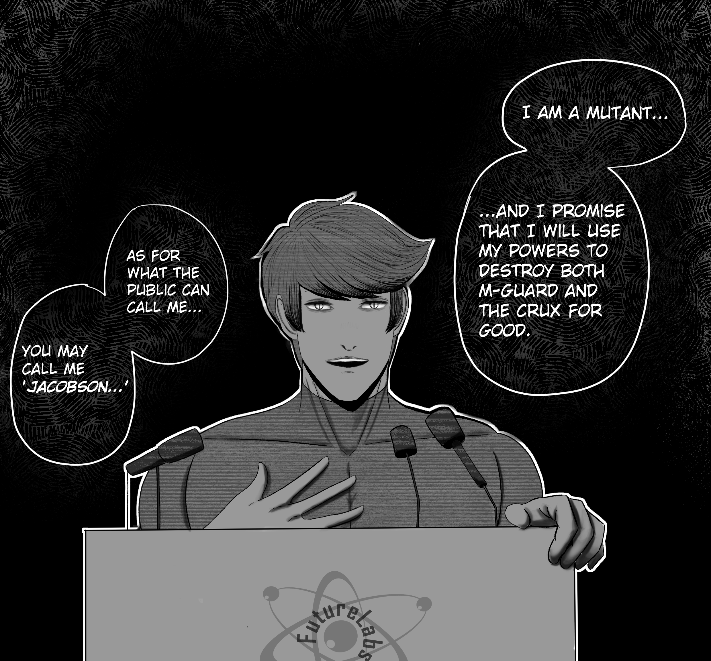 Where mutations are ruled by the psyche as much as the body, Conduit's eyes, akin to shattered glass, are thought to be a reflection of something inside that was perhaps broken in the first place, as he *did* live as a mute until getting his empath powers-- powers that imbued upon him the ability to speak that he had desired all of his life. However, these powers made his life worse in more ways than they did better, ultimately sending him down a path from where he would no longer be able to return.