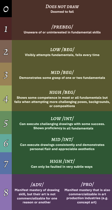 >>7854158I don't get it neither. These sorts of tables and categories are borderline infantile and obsessive. It really doesn't matter. Just draw and have fun.Look at this post and you will see the usefulness of such a table:>>7854239People are completely delusional about their progress and the vastness of skills they do not yet possess. To compare your skill on a metric can be motivating and helps you hone your skills according to a few basic fundamentals that need to be there.It's not required to use or obsess over lists, but they surely have a place.