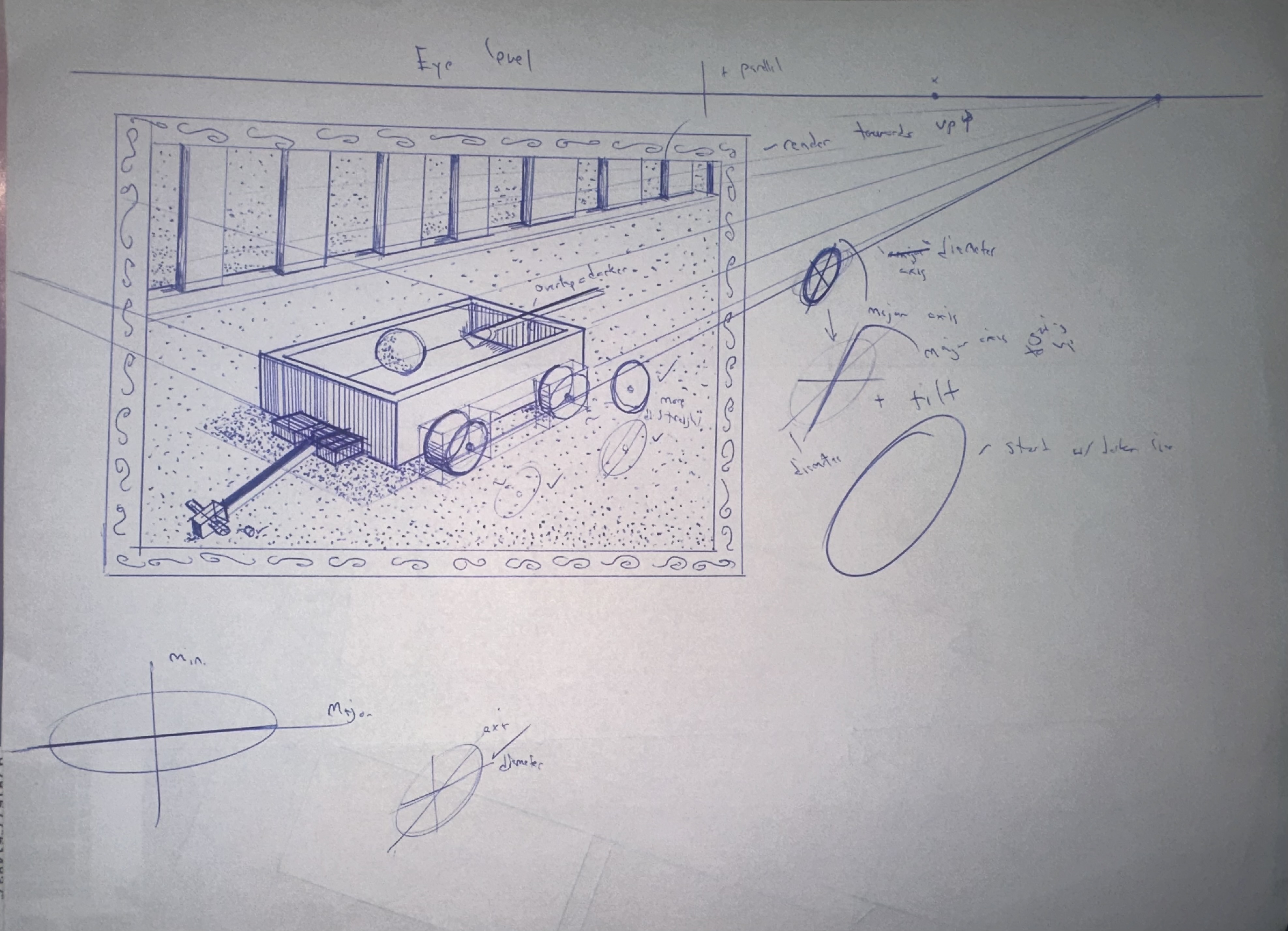 >>7850743I used a 2 point perspective for it so the room ended up a little distorted. But that wasn't the issue. I just really got lost at some point. The fuel tanks are all a little wrong in some way or the other and I'm only now noticing I forgot a pillar on the left wall. There are some other mistakes too that I was too lazy to fix, but what's done it's done. This is only meant to be a reference sheet/concept art after all, not a final product.