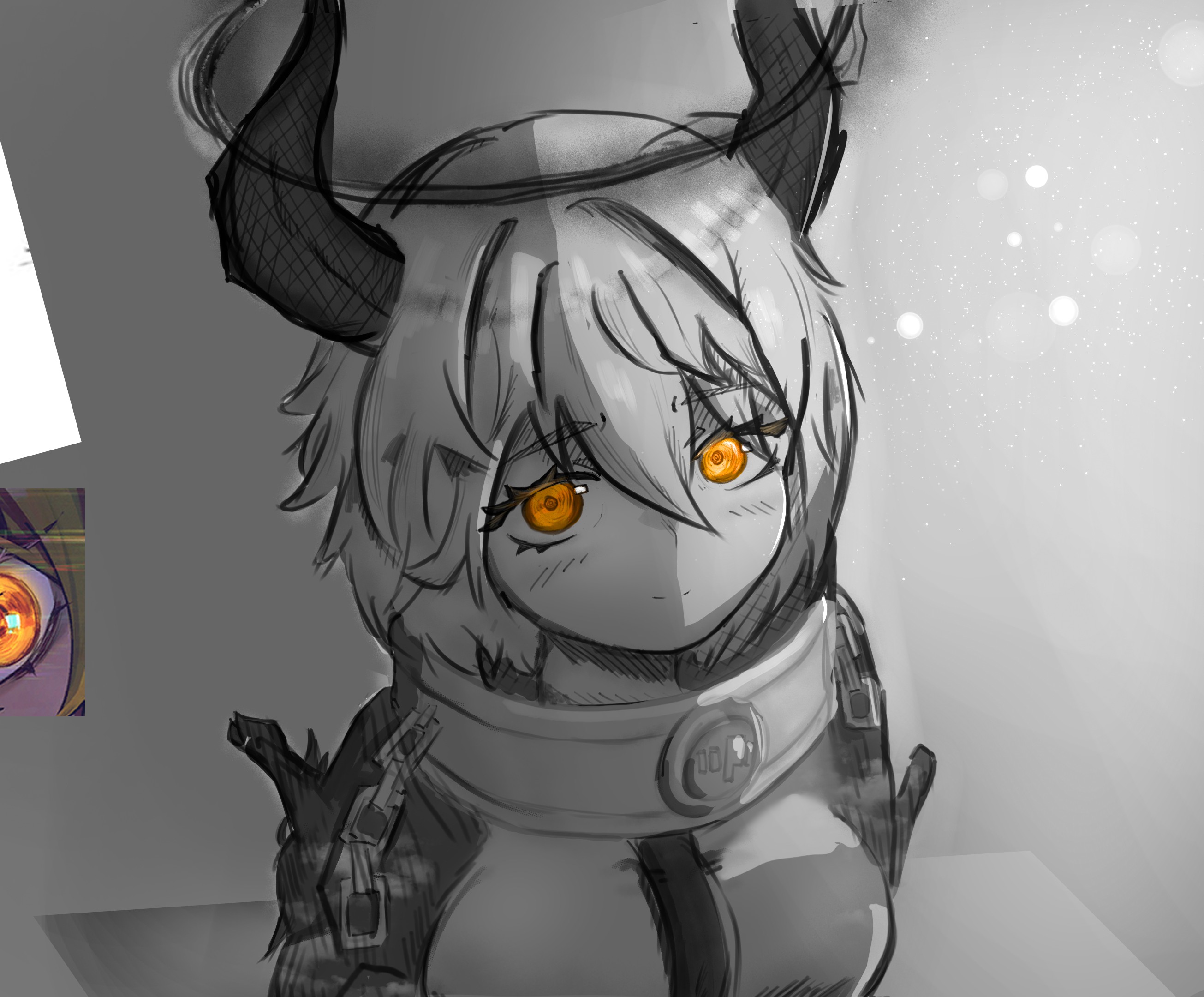 >>7854504It's a general contruction and perspective issue. It's not by much, but the right eye is placed on top of the skin, and it should sit inside the eye socket. Place it a bit further back, and make sure to leave some more room for the cheek bone and socket. Also, ever so slightly, the perspective is just a bit off.