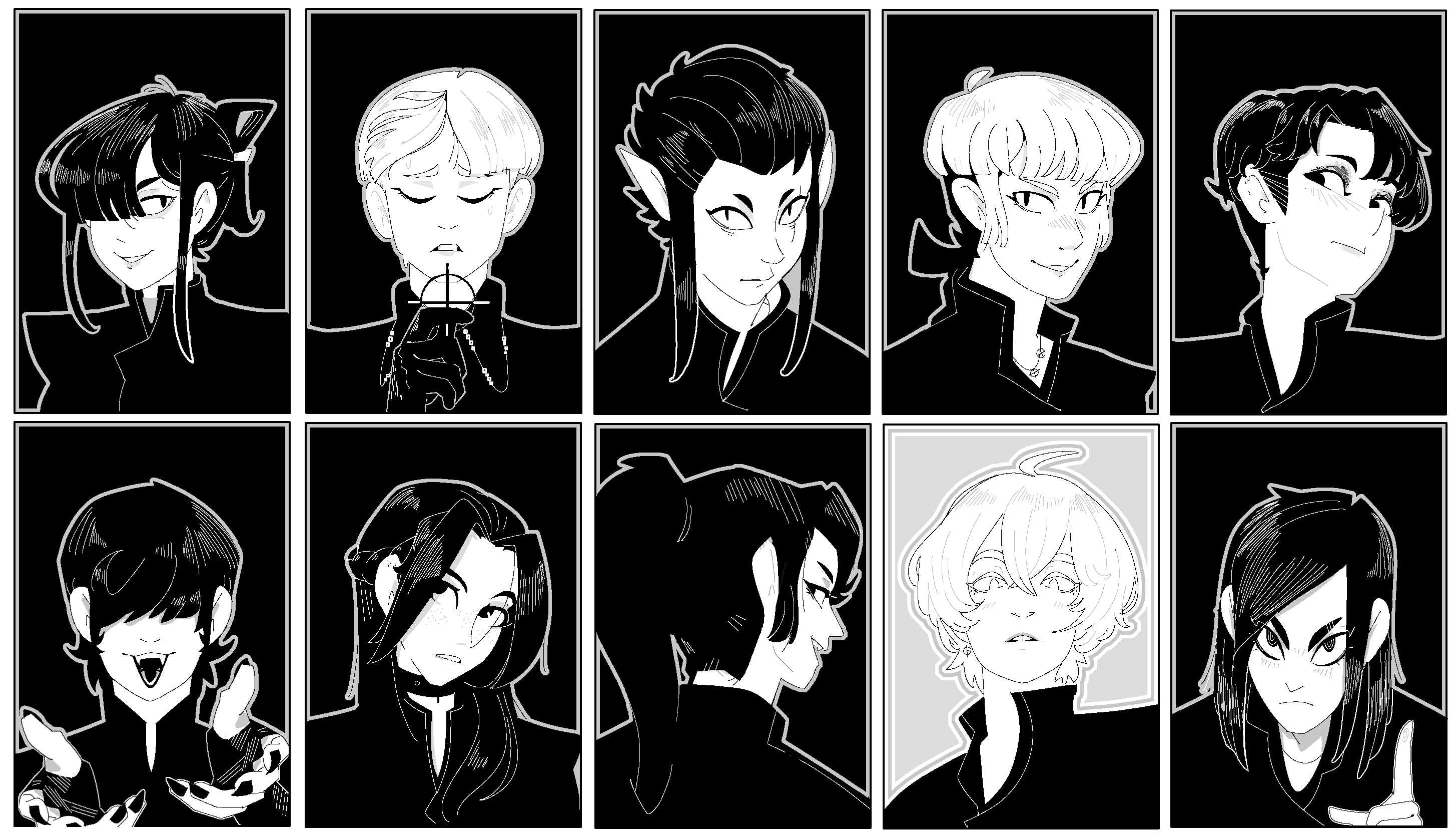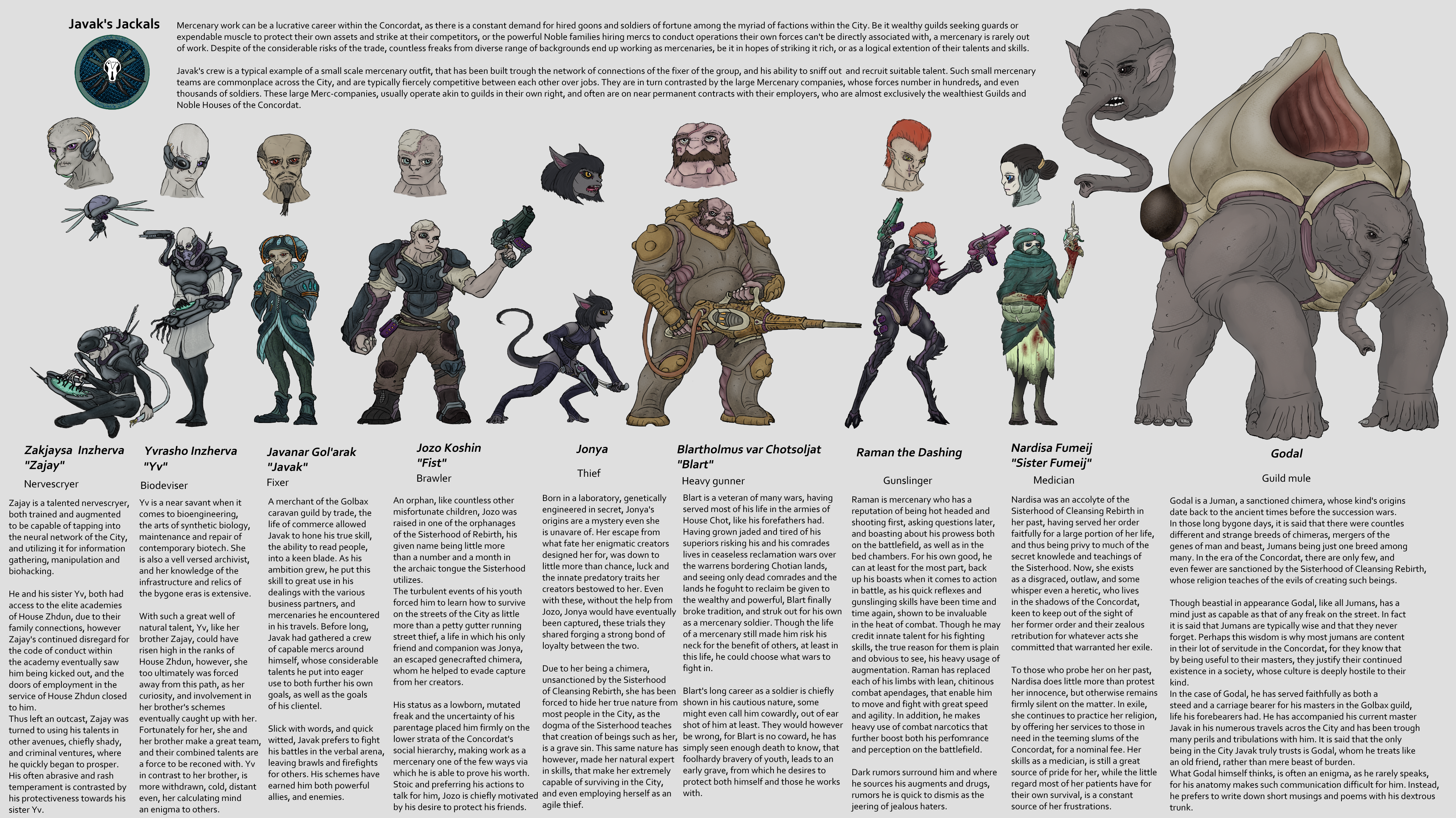 >>7854885I haven't done images in the style of these faction infographic stuff like this>>7854485 for gangs and non major factions of the setting yet, but when I am done with the major factions I intend to depict gangs, commoner militias and what not as well in a similar format. The closest thing to a sort of private contractor type of thing I have drawn are these characters I drew few years ago though these were mostly me trying to design a bunch of characters I could potentially use for telling stories in the setting. The designs of these characters are also up for a bit of a refresh as well as they look a bit off and kind of bad to me these days. I also need to expand the roster to make the merc company concept work better as in this one there are to few combatants.