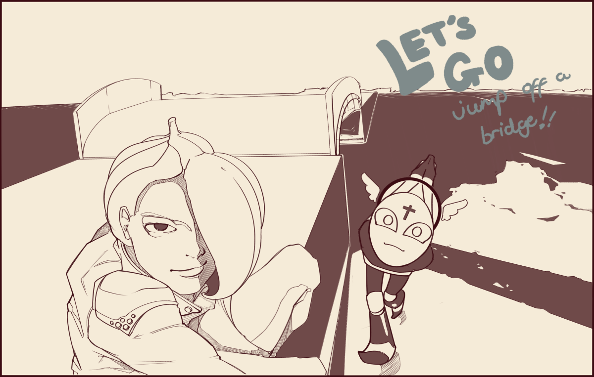 Watch LIVE as the artist tries and fails to draw water in two tone.Got some mixed feelings on this. Really loving the line work, and I think the environmental composition is interesting, but the eyeline is a bit too high and puts too much focus on the background rather than on the central characters. I'm trying to mix art styles here between my more realistic, stark style and something much more cartoony and exaggerated for the angel, but I don't think I delivered on it as well as I wanted to. The posing hiding the foot that's presumably holding the man up on the edge of the peer isn't good either - that's a pretty important part of this pose. I wonder if the whole thing wouldn't have been better if it was shot from the opposite angle, from the bay looking up at the two. It'd give a dynamic feeling to the angel hovering above the water while the man sits on the edge turned to the viewer with slight disgust, rather than here, where it kind of looks like you just turned over a rock and found a bunch of bugs having a party. I also think, if I were a more experienced artist, I could have handled the shadows on the water better to make it feel more like a body of water, especially near the bottom of the page, but I'm very afraid of spending too long on it, zooming out, and realizing it's way too detailed and is distracting from the focal point of the image some place between the two character's heads.What does /draw/ think?