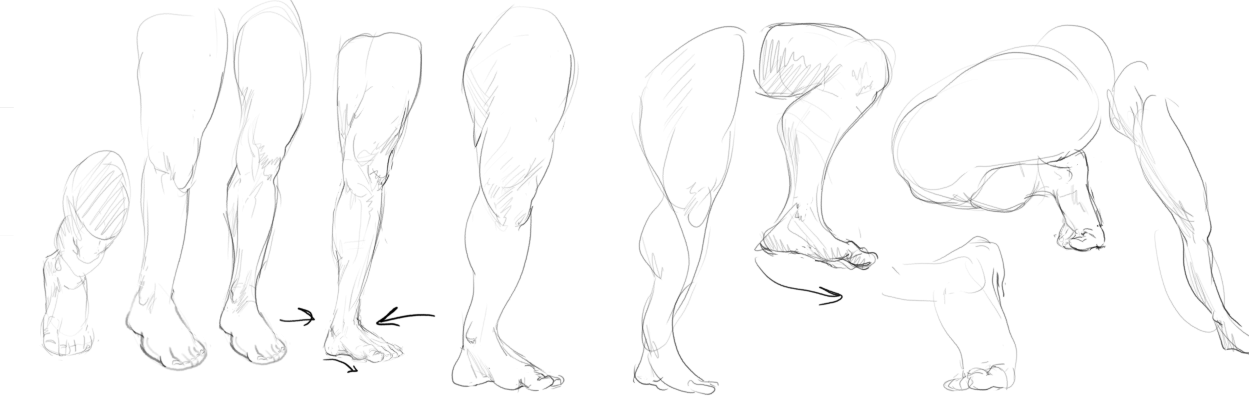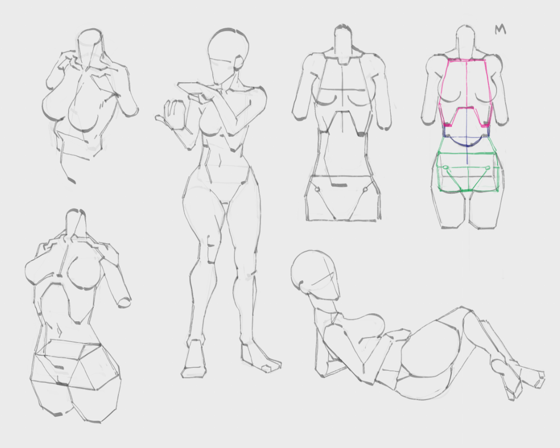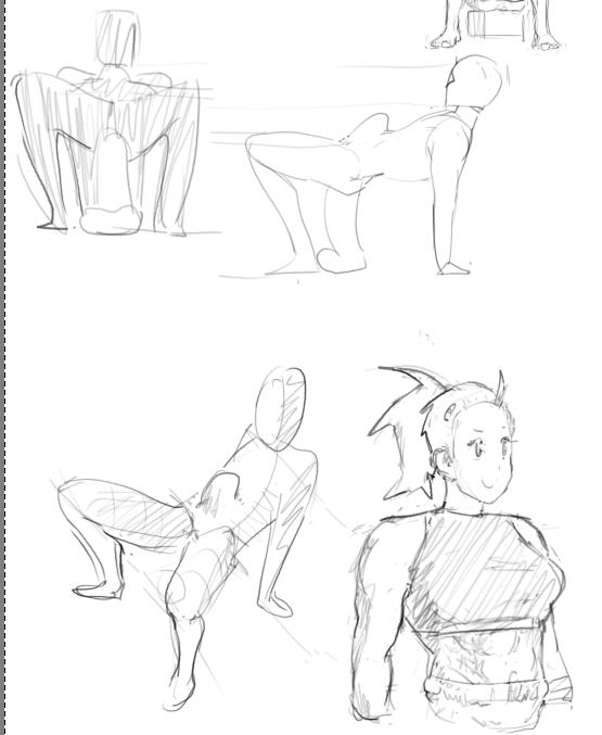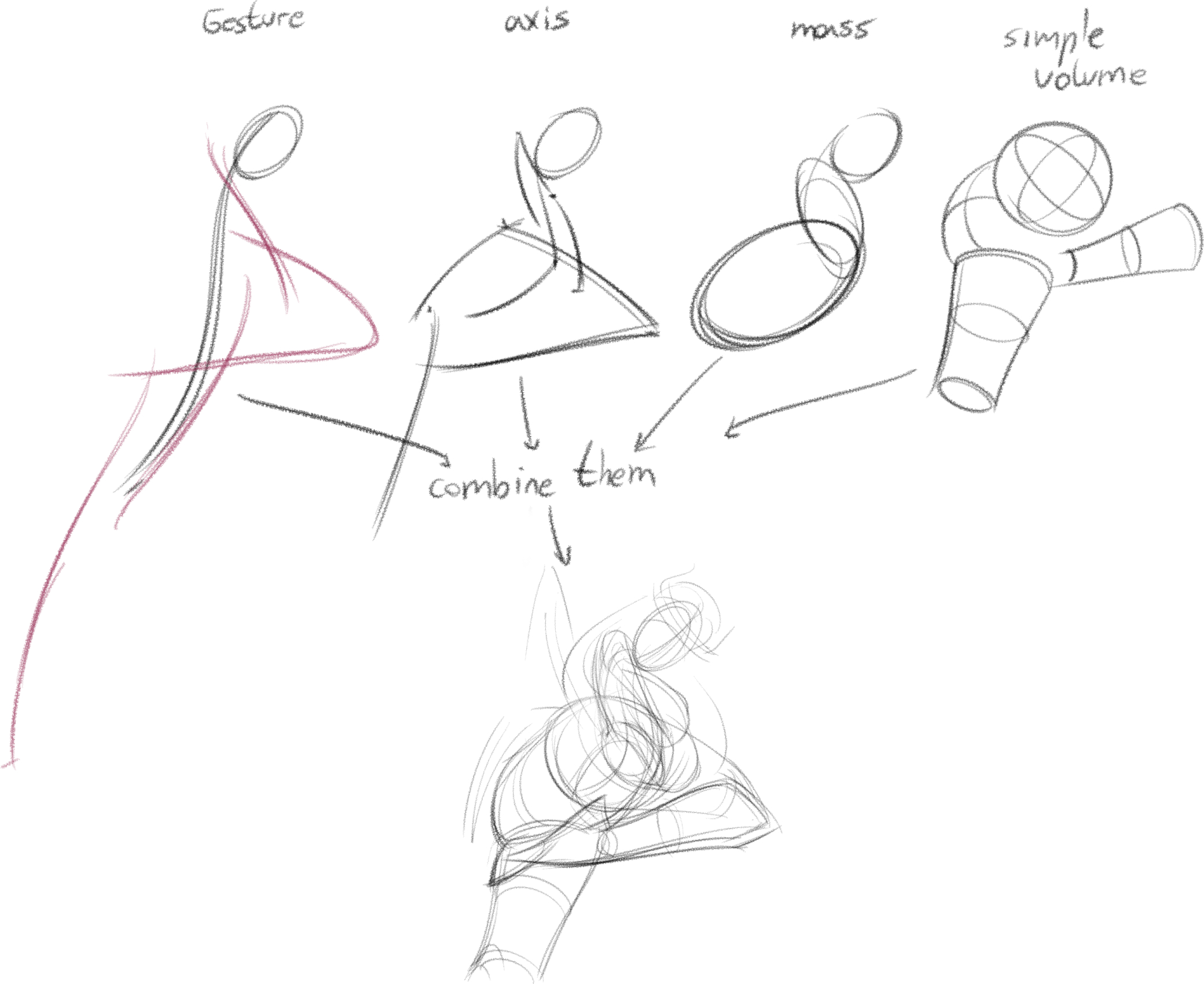 >>7863095Keep the gesture simple. One line for flow, one for a stabilizing force, large masses blocked in loosely. This doesn't work unless you know 90% of what you're laying down and why (eg, the legs and pelvis obscure the stomach in a shot where the character is vaulting over something and coming "at" the camera). Then use wrapping lines to establish what is where. If something is receding, just wrap it a few times to show it moving "back" into the picture plane. Reverse for whatever direction, really. This helps keep things organized for when you clean up and establish the anatomy. If
