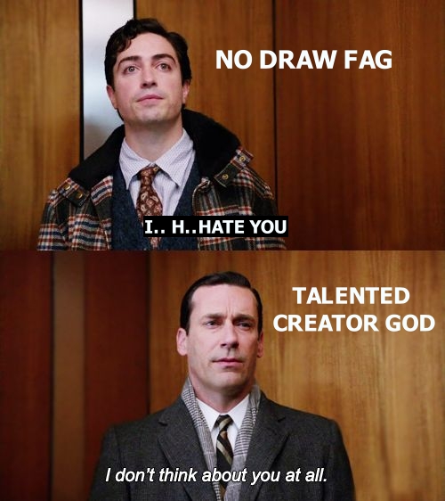 >>7863064Maybe. That could be fun>>7863066Speaking from experience, I've meet plenty of nice people that were both good and bad at art/drawing, and likewise the other way around. It depends on perspective, I guess.>>7863071Yo, great drawing.
