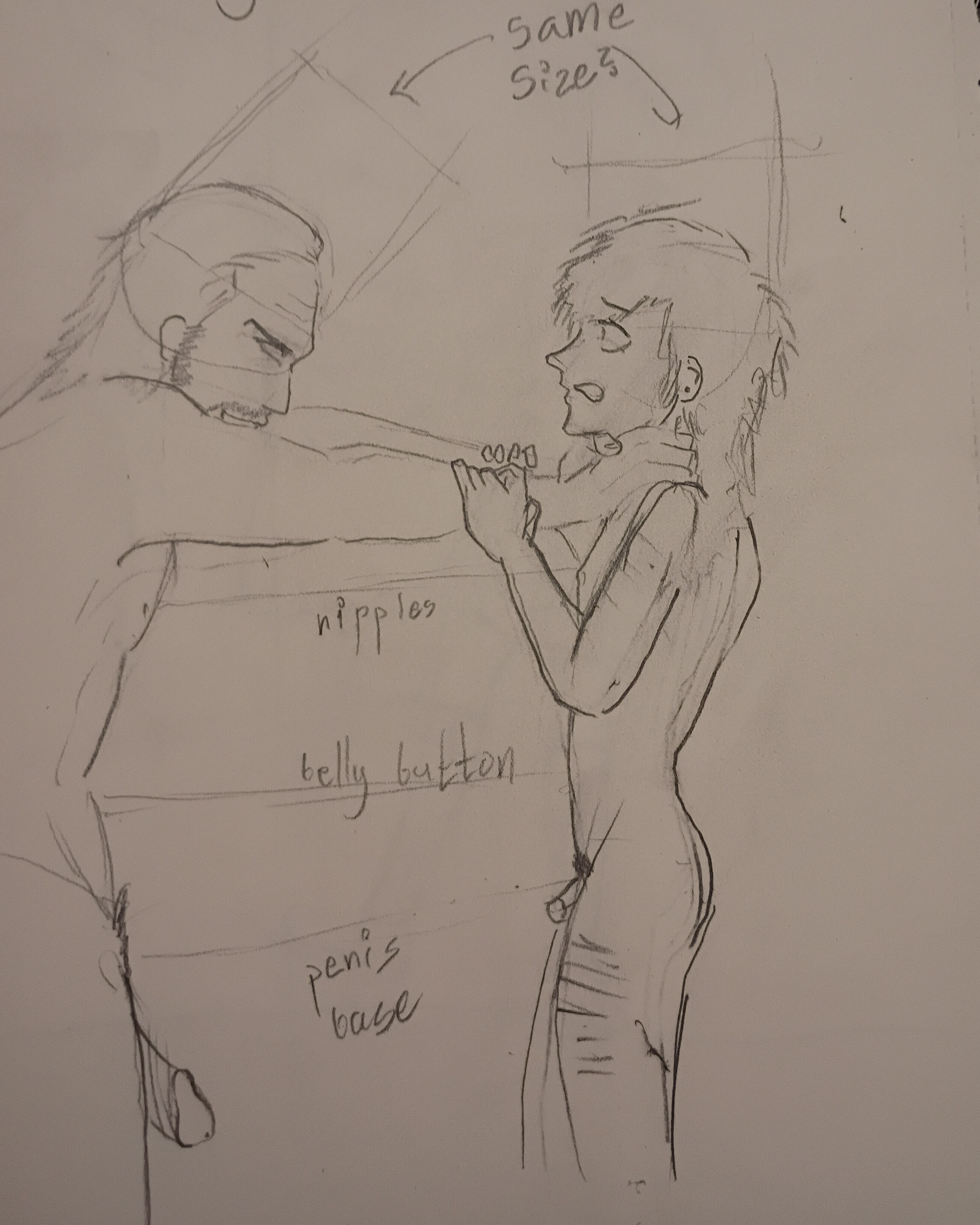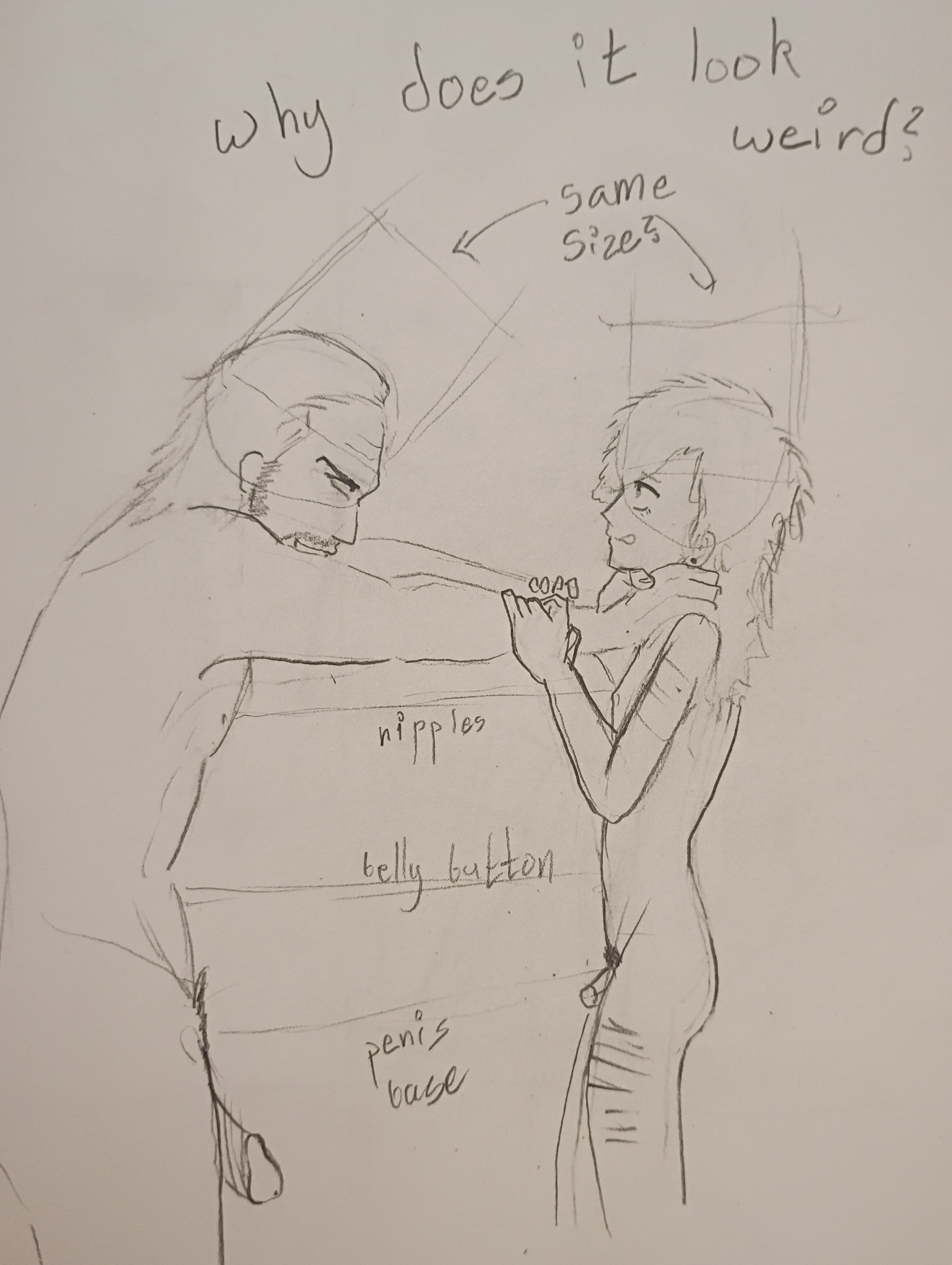 why does this look weirdthey're both adults, the head size is the same, the body size is close enough that the nipples, belly button, and pelvis are at the same heights, the hands are the same size etc, but the guy on the right looks too shota and idk what to change to fix it