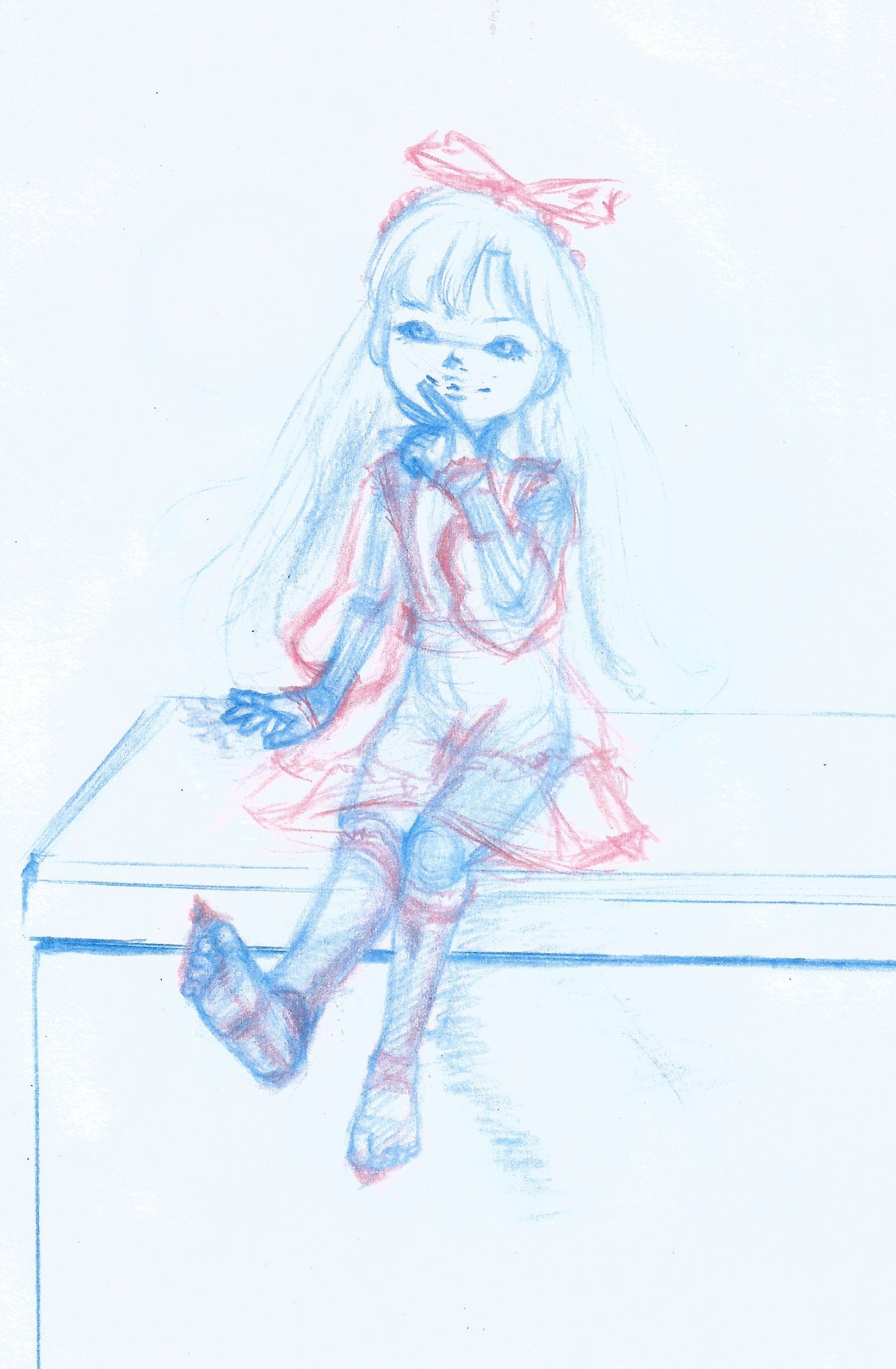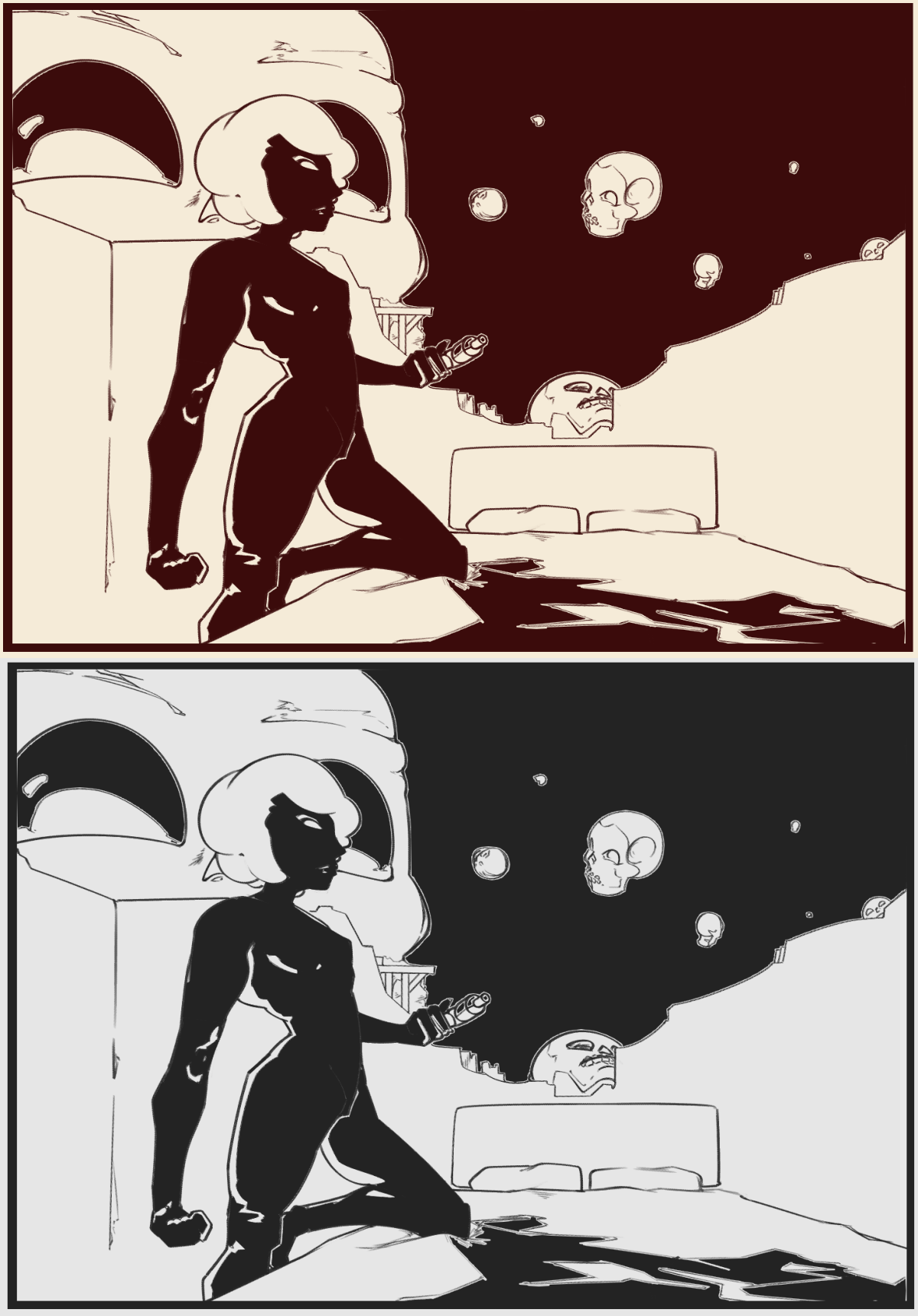 Inking considerationsI've always used red lines on a yellow-orange background when drawing - yellow-orange is easier on the eyes, and red is its compliment, so it stands out more. But now that I'm really trying to make a quality product, do you think it's time for me to move on to using black and white?>pic related (the black/white here looks blue-tinted, but it's just an optical illusion)