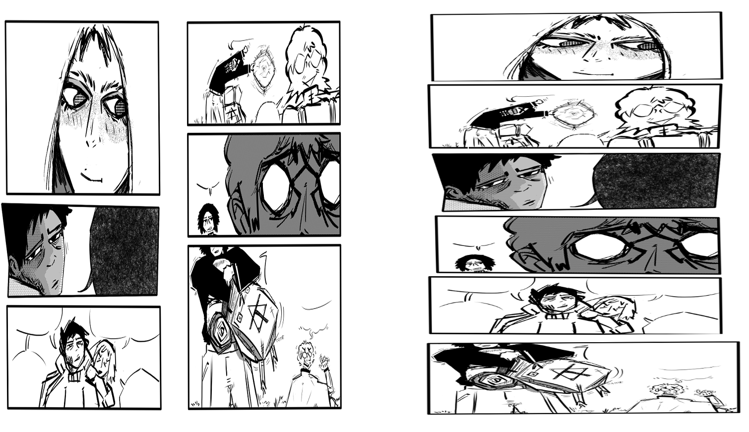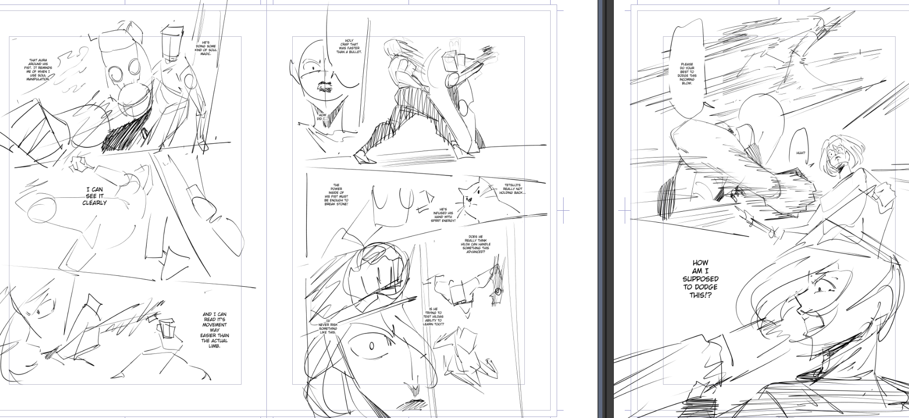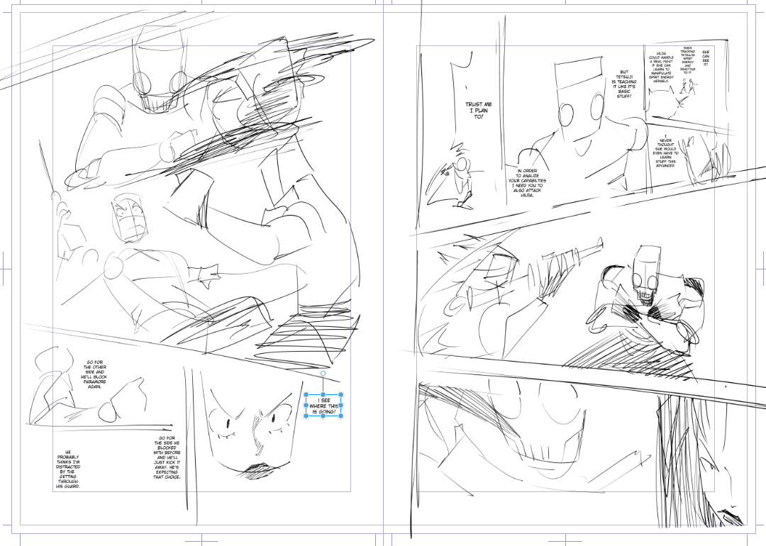 I've mostly been keeping to myself while I figure out this group of storyboards. The start of this arc had a much slower pace than I expected from the script. I ended up with a complete deadzone when it comes to action. 5 chapters without any fighting. I decided since tetsuji is going to teach Hilda it would be better for him to test her immediately. Rather than rushing to where the rest of the arc takes place and having to teach her mid fight. I'm trying to introduce a power system that all the characters can play around with relatively late. I want to pace it right so it lands with readers that might not have expected this. The basic elements of the system are really generic so I want to introduce them quickly and present the unique stuff faster.>>7882336these layouts have been great