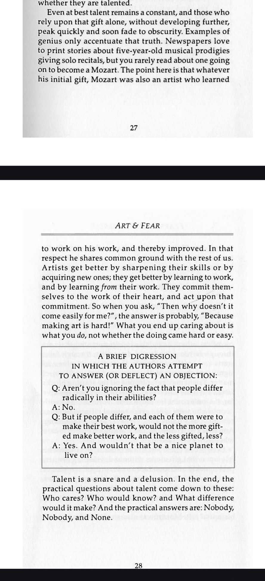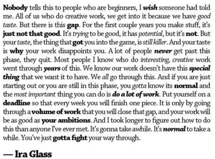>>7881396>>7881666This, the argument on talent has been discussed to death and pretty much settled. I like the section from Art and Fear on it because I attribute most of the gains made to plain old boring "learning to work on my work". Try to get the people who think they can improve by finding and proselytizing what they think is The One True Art Truth on /ic/.