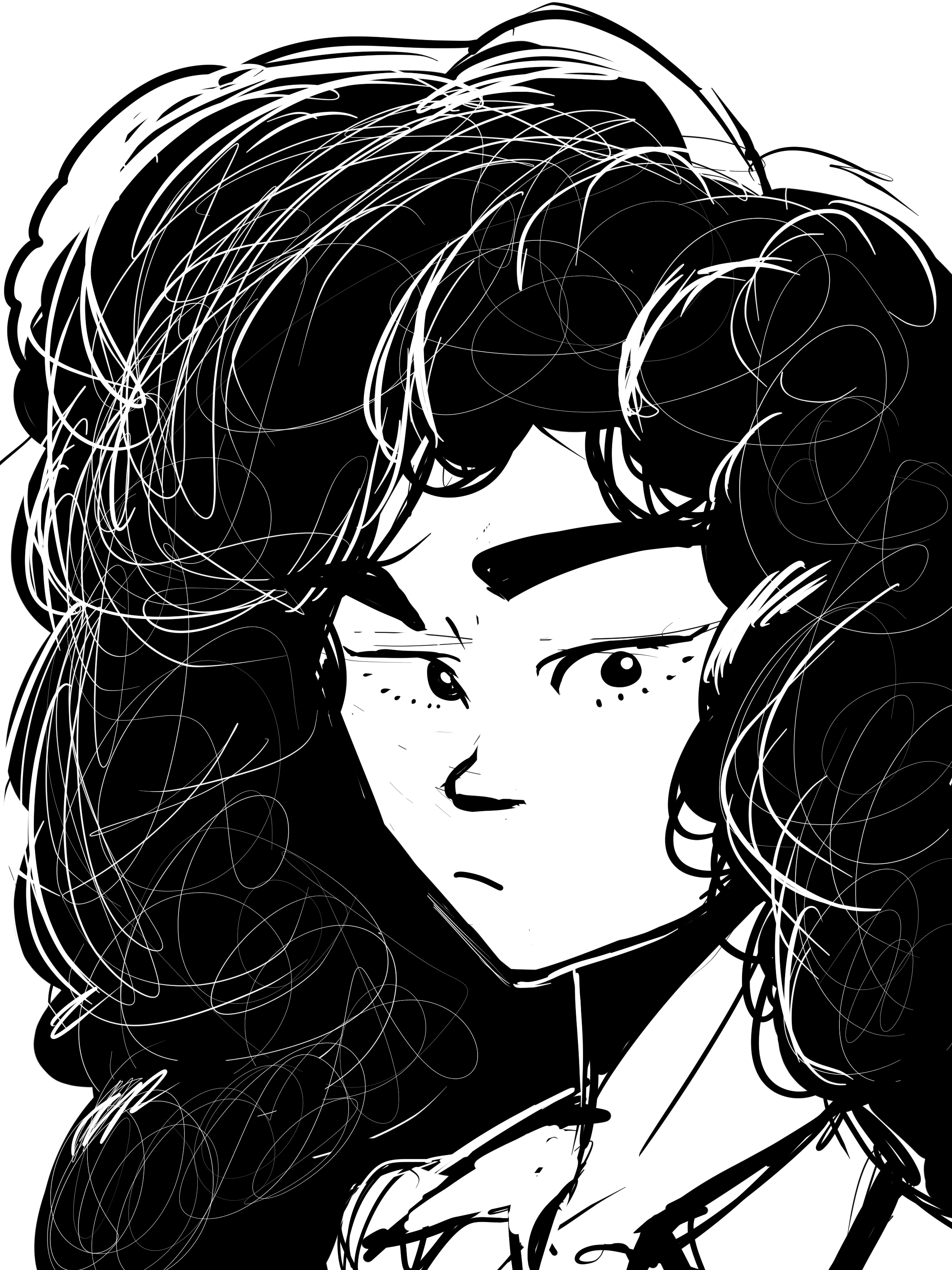 I'm experimenting with rendering complex textures of hair. This was ballpoint pen followed by black gel ink pens deepening and defining dark shadows.