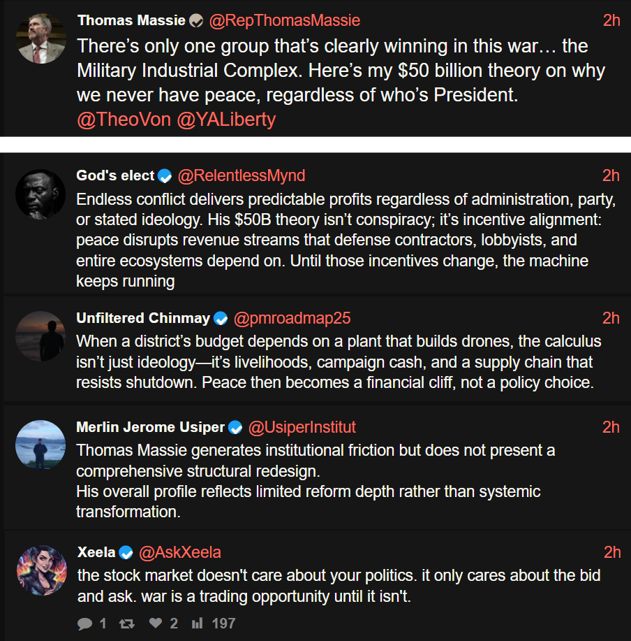 >>7885976X is about 80% bots now, and I'm not even bullshitting. I use it mainly to follow news/current events and so many of the replies are obvious ChatGPT slop "commentary" on whatever was posted (see picrel, congressman's post followed by bot replies). The difference from, say, YouTube, is striking. Most comments on YouTube still seem to be from actual people, or maybe they're just more advanced bots.