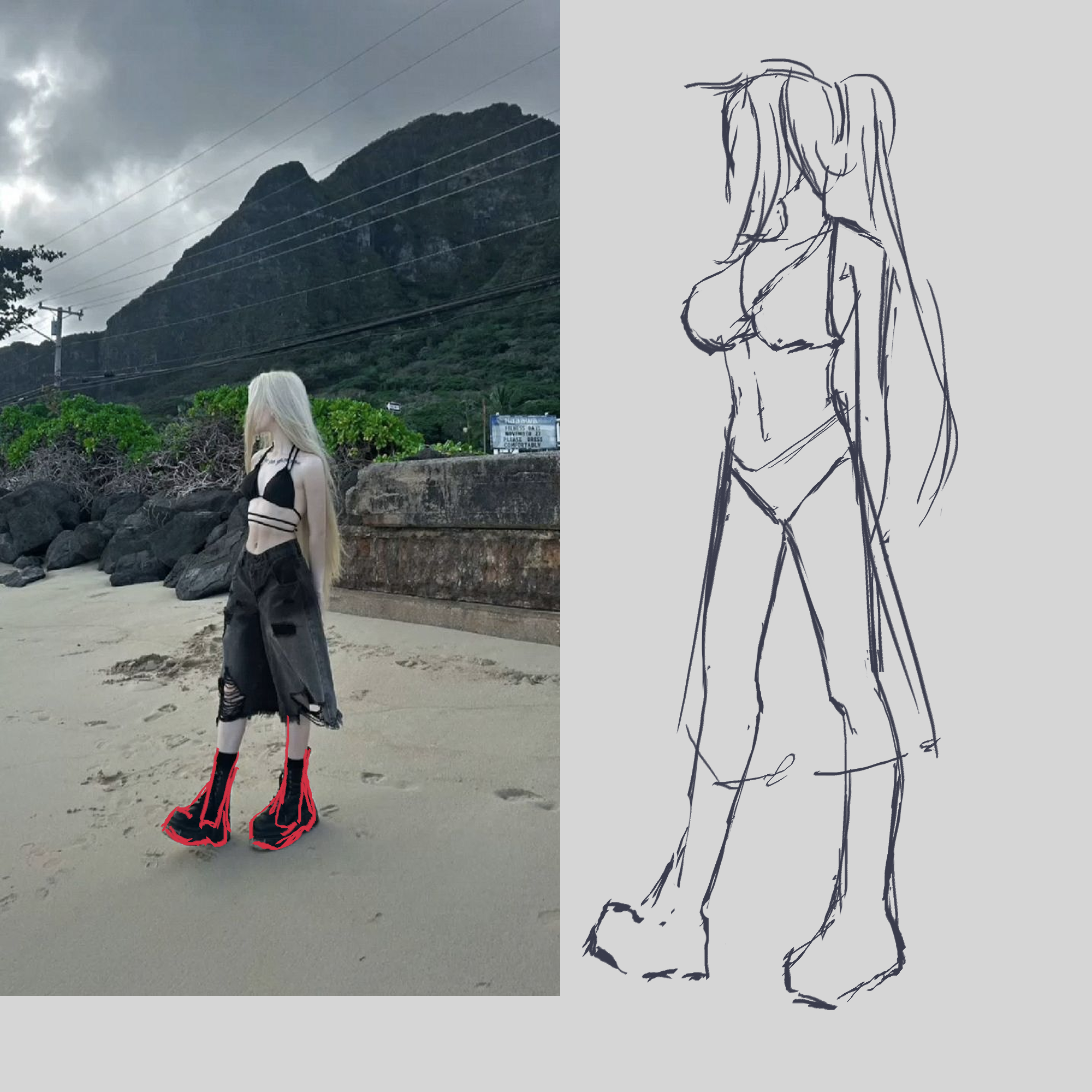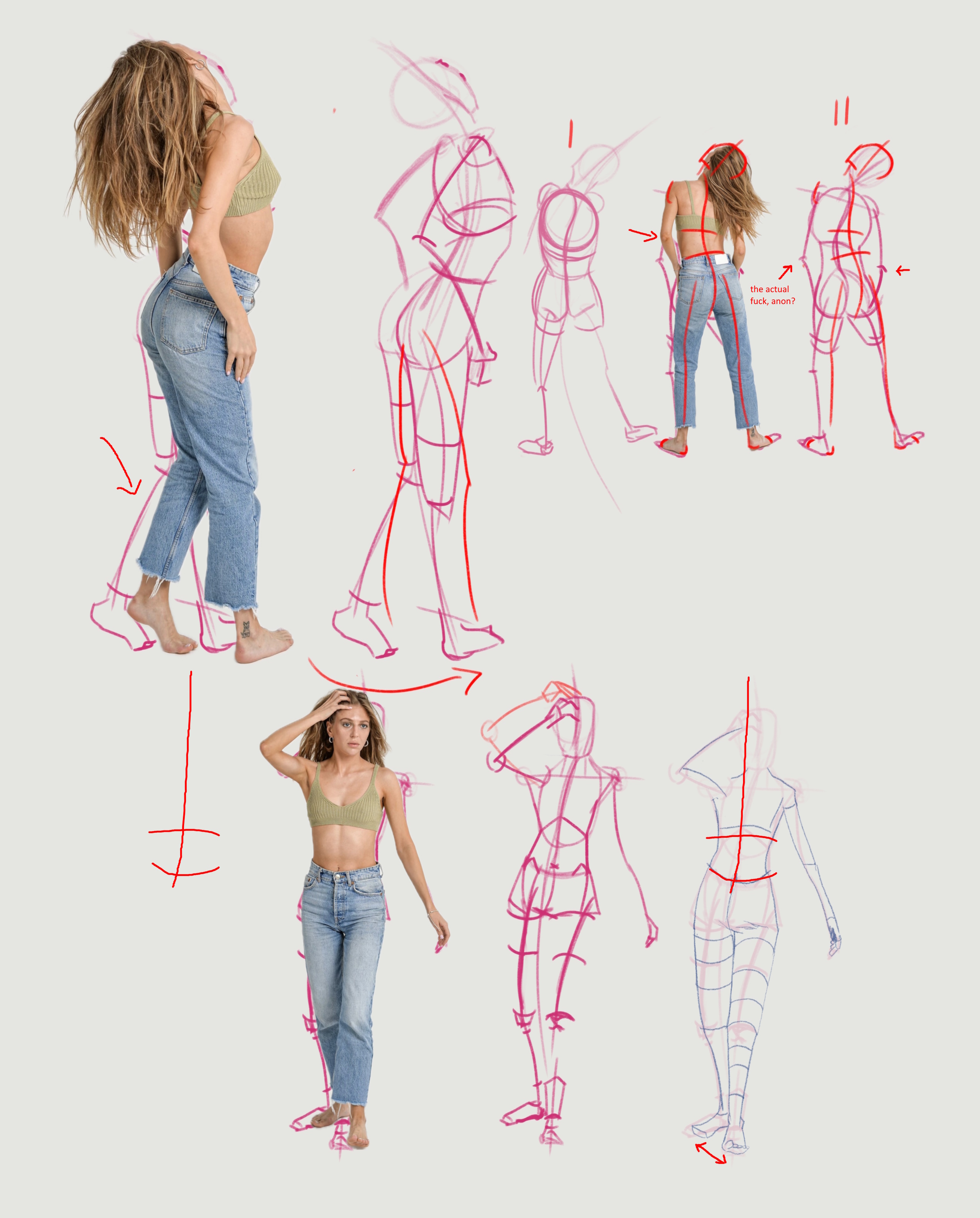 more gesture attempts. feels like i am slowly unlearning how to draw.Anything stupidly obvious i should do different? I am thinking I need to re-read some books, but thinking is why i tense up, pressuremax and fuck up quality and accuracy. drawing the redlines over pose 2 was ezpz compared to all that went into actually drawing attempt 2 at said pose.