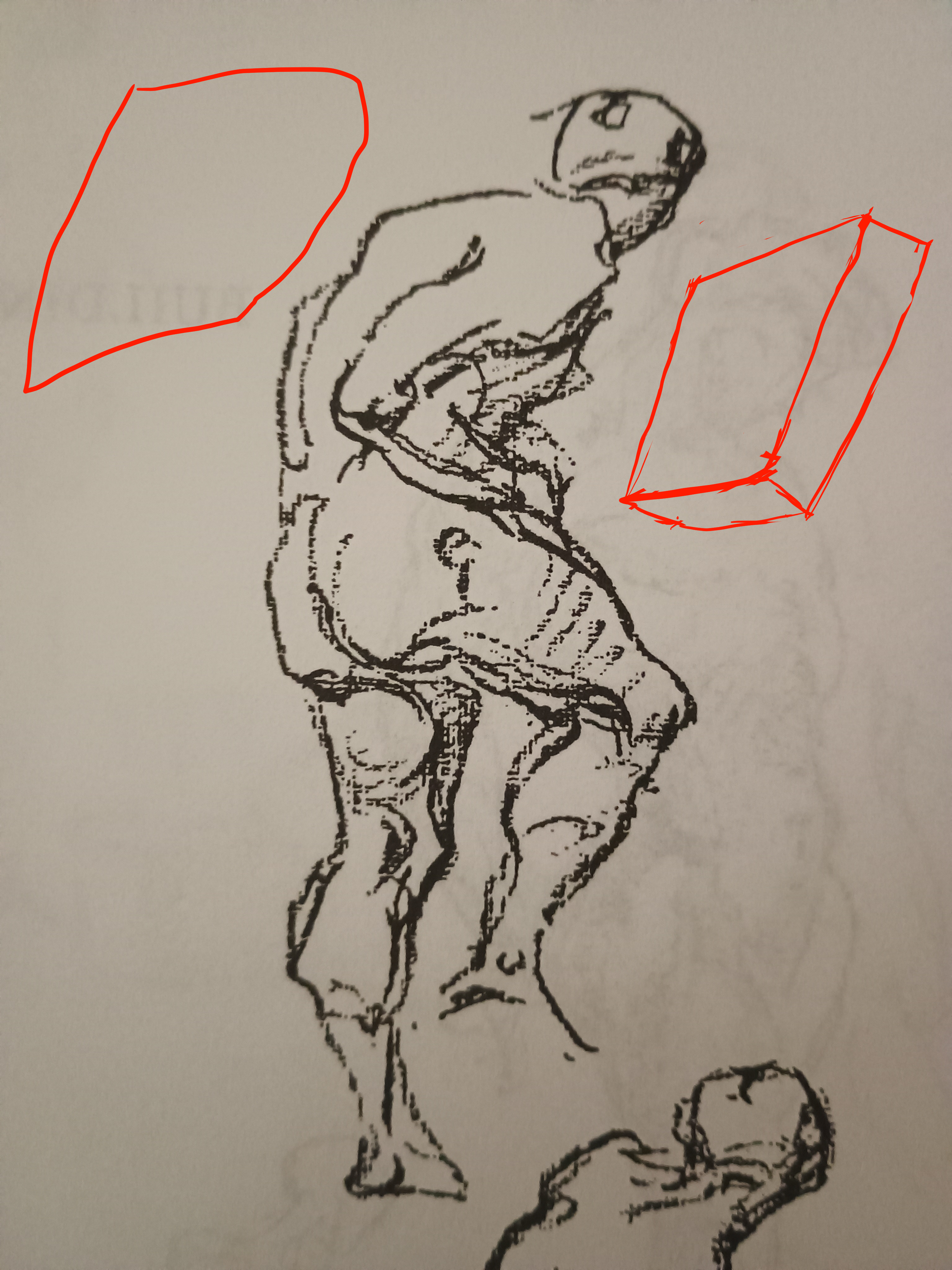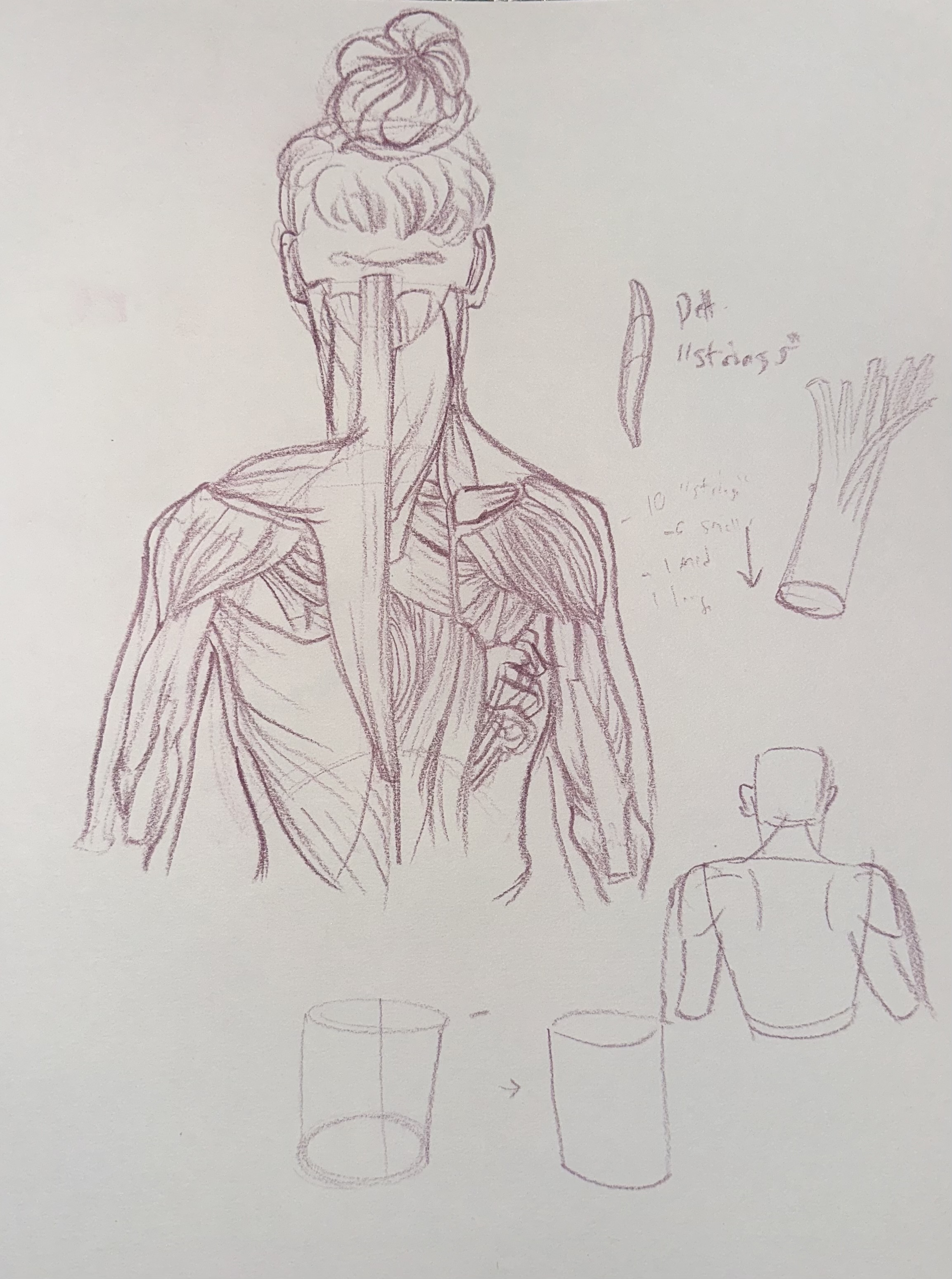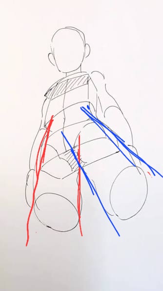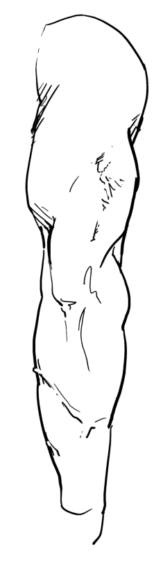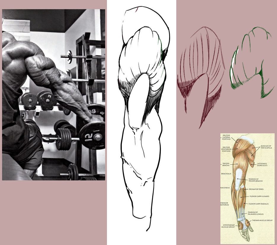 >>7896219Here I really exaggerated the striation effect on the triceps, following both the photo and a more anatomical guide for the direction of the muscle fibers. The red drawing was simply getting a feel for the form underneath, and the green one was testing the direction of the fibers.