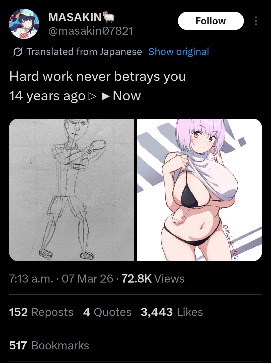 >>7895759It's a good drawing, but weak progress for 14 years. Seems more like consistency rather than hard work.