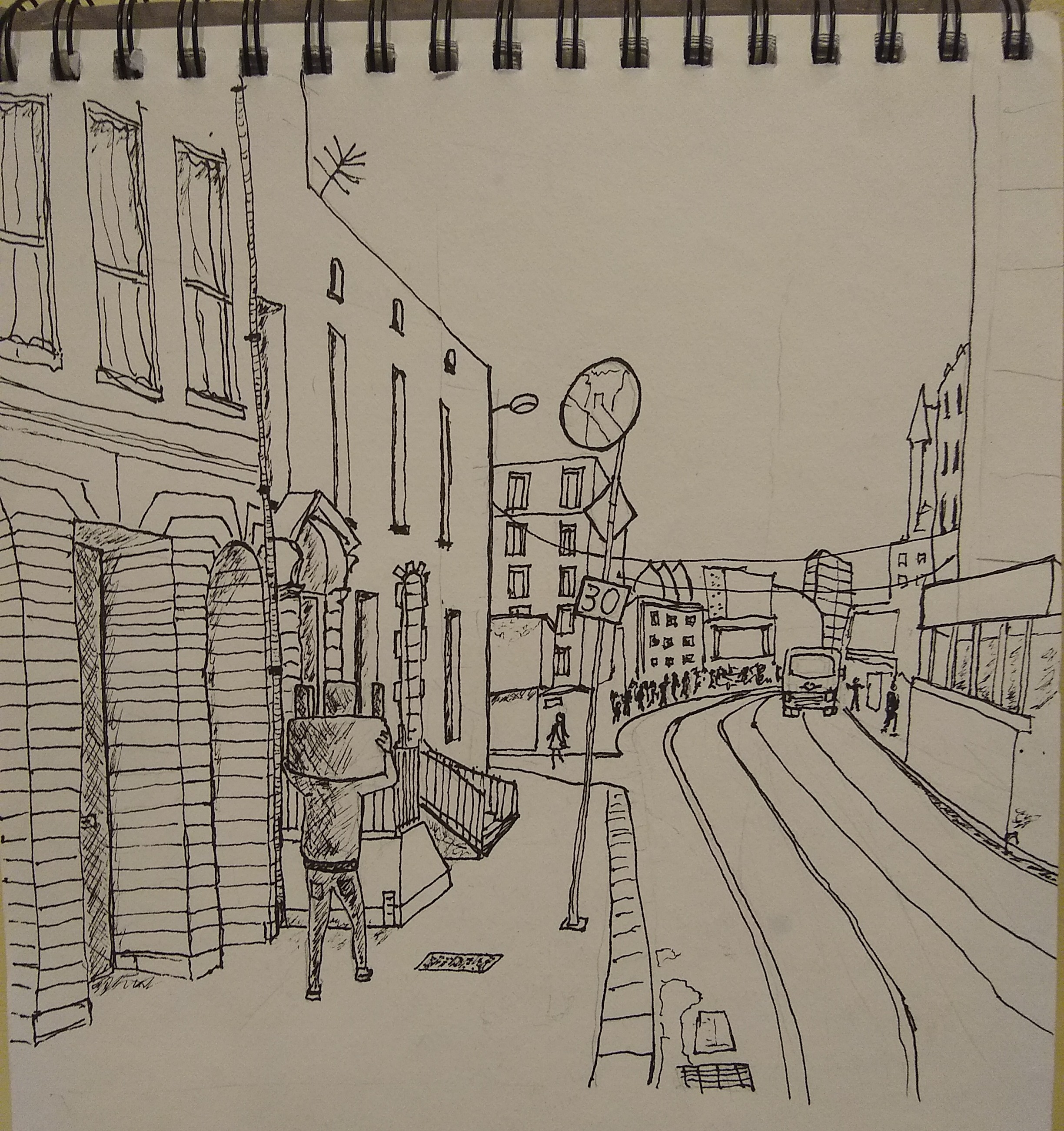 >>7895967This is very unclear. For something like this, try drawing a Birds Eye view first, then plot where the viewer is standing, and THEN establish your horizon line, vanishing points, and draw from there. Something complex like this requires more planning which you seemingly have not done
