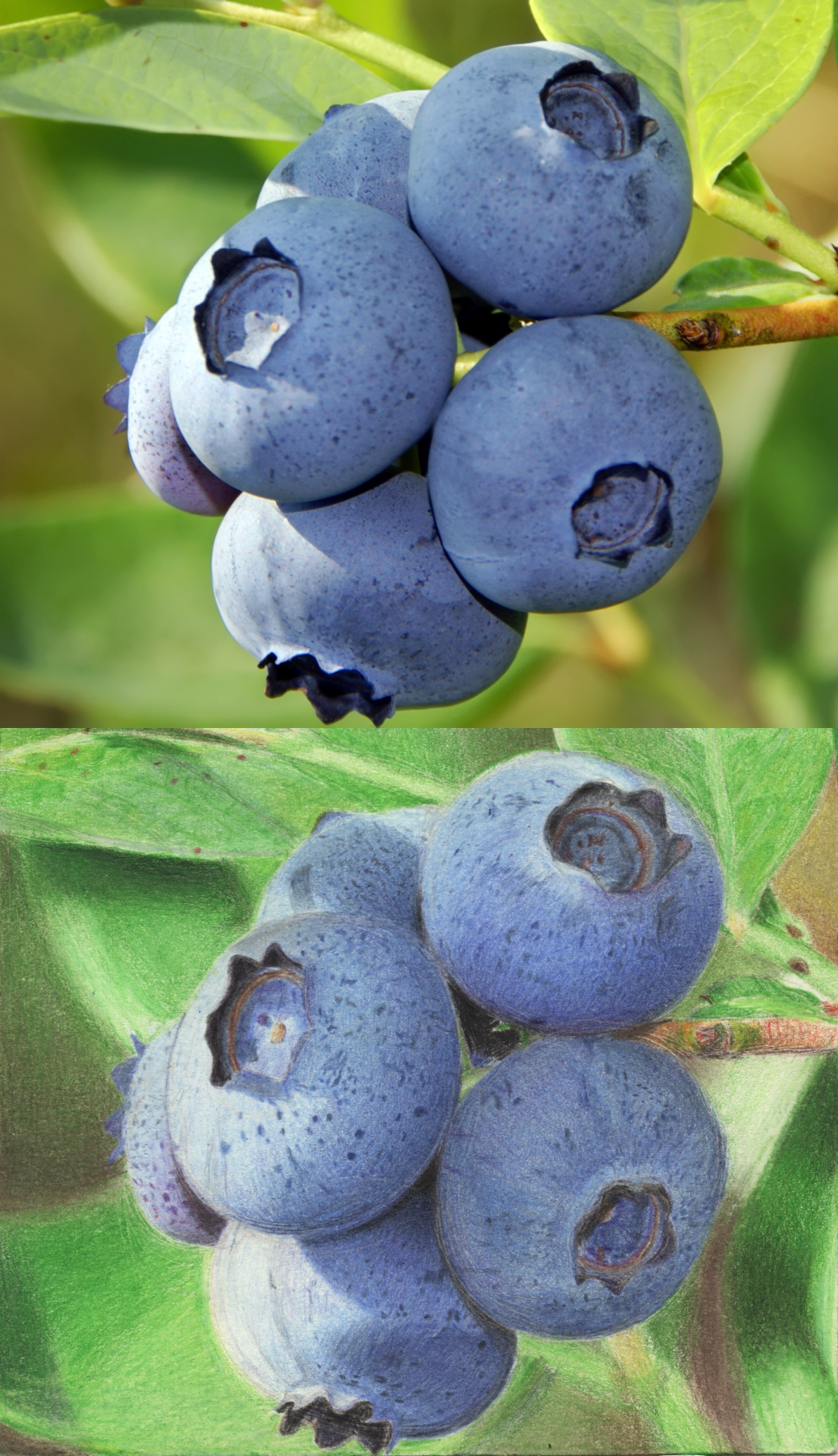 the main thing I'm noticing is the overall lack of contrast (colored pencils blah blah blah i know). the culprit for this is your lighting and shadows. all of the darkest shadows (inside the calyx of the blueberries and the shadows in between each berry) are different values entirely. They're around the same in the original image. You are able to pick up on this contrast but it isn't applied consistently. You're also able to see the lighting correctly, but it gets lost in translation into a mess of very gradual gradients. I think the main thing to work on is getting the values of the image down in your head before acting on them. Some of the contrasty bits are also lost entirely, like at the top of the bottom blueberry in the original, the shading is fairly flat before it cuts off to the background behind it. You added a shadow gradient where there isn't one. Also, the leaves and branch in the background look like they're a culprit of you relying on drawing just what you see too much. They all kind of just blend together in a sea of green waves. You can render them very well, but visual coherency still looks off, mainly a culprit of values I think. I guess what I'm saying is work on values/luminance. Try using your phone camera while in grayscale mode if you have trouble with it, the mistakes are a lot more obvious when you take away color. Hope this helps.