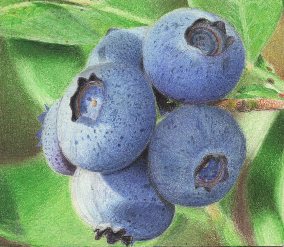 I wonder if I'm polluting the black graphite too much. For each berry, I started with layers of the lightest colors and then worked down to the darker tones. I had to do something I've never done before and start with a layer of white in the highlighted areas, because Polychromos don't blend nearly as well as Prismacolors do. That did seem to average out the values when used darker blues and light layers of black for the shadows.