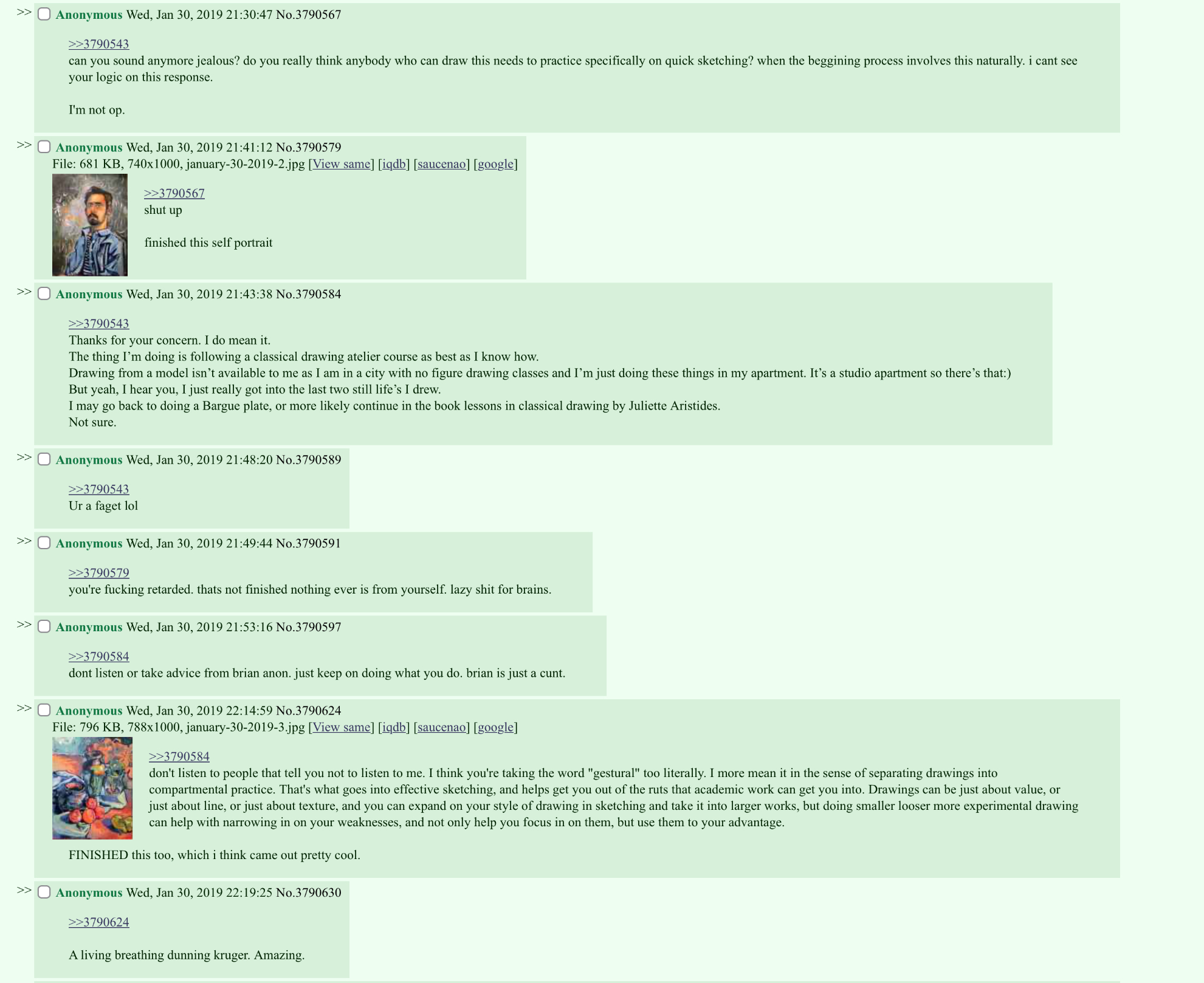 >>7909696Where is this psychotic hostility coming from in a traditional painting thread? You're basically screaming like a retard at a bunch of geriatrics in a calm atelier. Quiet down, or I'll call the police.