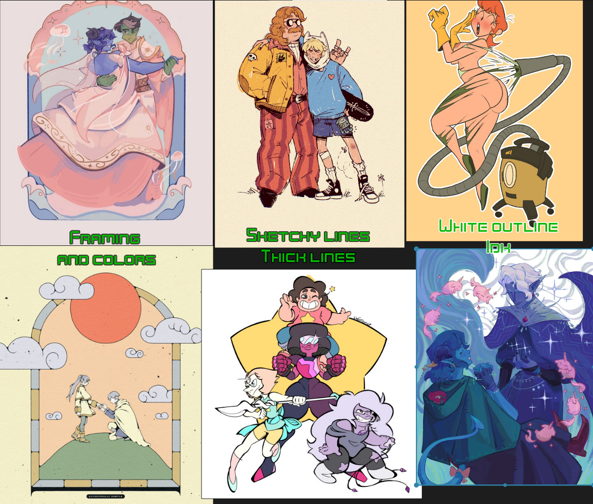 Create a moodboard of art that you wish to incorporate into your style and post what it is you want out of the art work. Then folks can make suggestions link tutorials and such to help.