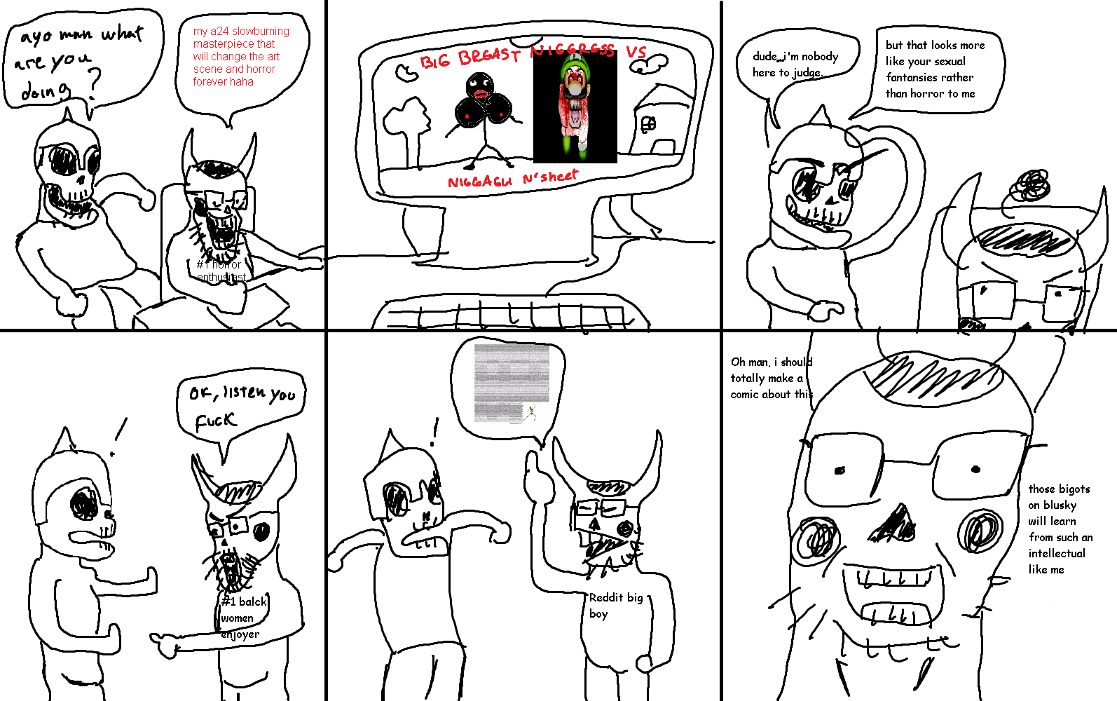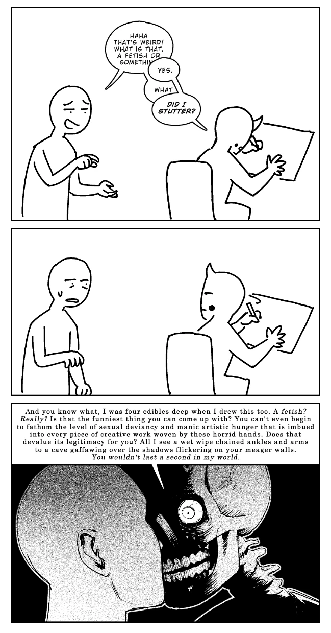 i vaguely remenber some comic in libtard twitter splinter (bluesky) were the op sperges about the "author barely disguise fetish" meme and the punchline is a massive wall of text/rant about it[redditspace]and yes, my art is doodoo i know