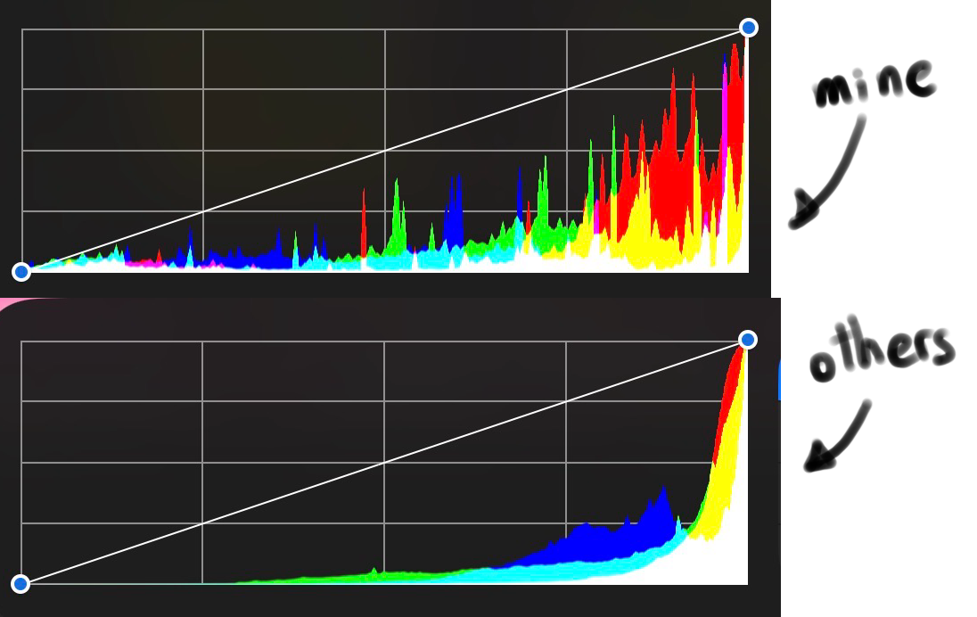 Is there a reason for this? I have been checking how the histogram goes smoothly while mine is full of spikes all over. And like I don’t know, I follow the same process, I use all these blending layers same as everyone else, but I still get these weird spikes and I don’t know what they mean