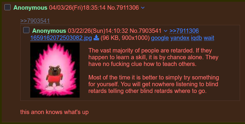 >>7914421>self-disciplineAgree with you on every point except this one.It doesn't take much discipline to continue doing something you're already good at (or at least better at than anything else).That's why starting to draw from a young age is easy mode compared to an adult because it takes actual discipline to get better at drawing as an adult. Not so much before that.It's 100% true that a lot of really good artists got to their level with little struggle. They drew because they felt like drawing and rarely did they struggle. I personally know this because I never struggled much to learn how to write. I literally do it all day, everyday, and it's very easy for me to do. I didn't have to have "discipline" at all. That's what talent looks like.Just want to make people aware of this because they'll often think too highly of really good artists and I want to remind them that nearly all of the time, that artist didn't work hard for their ability, they just did it a lot because they felt like doing it. This is true for almost anyone in any skill. Rarely do they have discipline. It's actually an extremely rare skill. If they're good at something, almost 100% of the time they felt like doing it. Not because they forced themselves.That's different from the vast majority of artists on /ic/ who show little improvement because they don't have the talent and thus have to force themselves through bad drawings to get good.