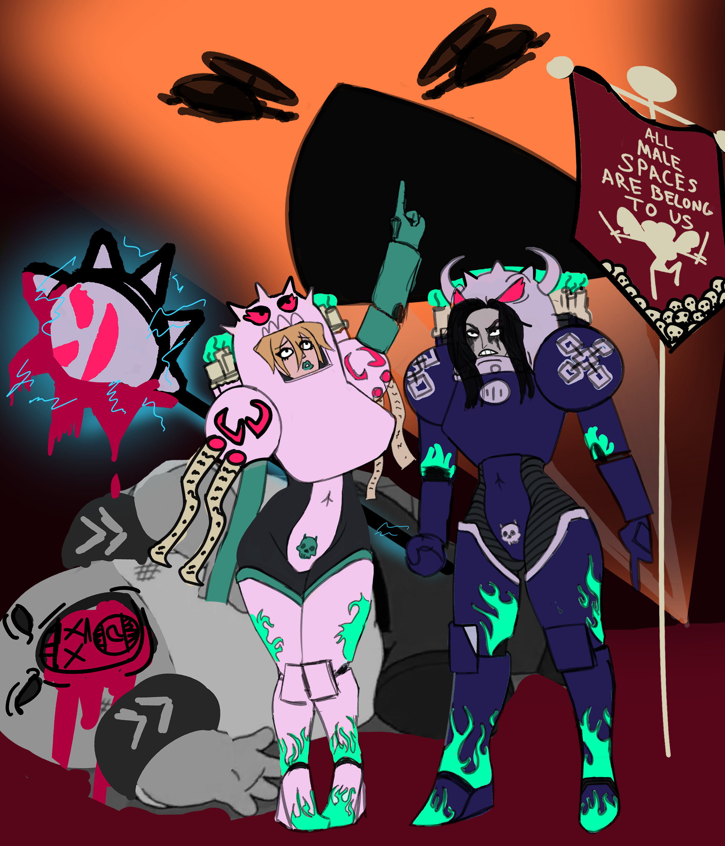 Female Psycho Warriors x Word Bearers. Tryna figure out how to make them look more Demonic, but not overly so.Also how to fix the composition (Chestnut's Pose is stupid but I think it's cute). I want the scene to look like Space King is about to curse the Female Psycho Warriors, Like God giving Caine the Mark of Caine.Important question is... Does it Vibe?