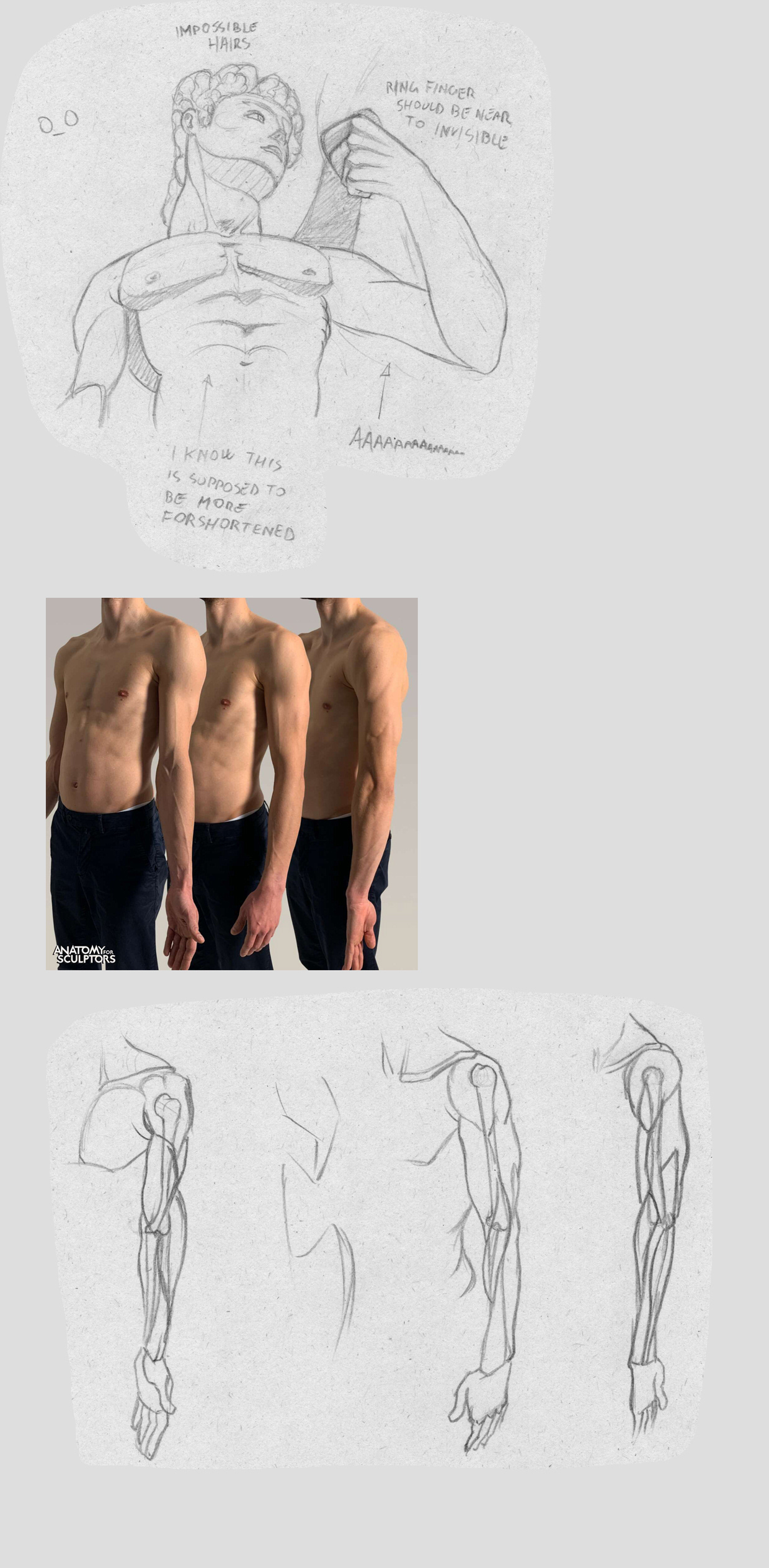 >>7920815>>7919568>>7919571>>7919599I did it again from memory (2 previous attempts were interrupted halfway, and deleted). I can't do better than this. I keep getting that arm wrong in the same way.Also. Today I studied a bit the arm muscles, and tried to apply later on a reference.I should've studied the arm bones too, but I went on memory with them.I recognize I keep placing the deltoid too much above the humerus, now.>>7920831You should already see that the arm on the left is broken (or has 2 elbows), while the one on the right is very slim.Anyway, you are clearly just starting... I don't know what could you help you the most at this stage, maybe the book "Drawing on the Right Side of the Brain"? Although, ignore every "scientific" thing of the book as it is unproven pseudo-science. The excercises are good though.>>7920921The frontal one has its charm.You should fix a bit the hairline on the side drawing. For instance, see the one on top left. You would expect the sideburn being in front of the ear, and then adjust the rest of the hair accordingly.(search for "sideburns" and observe)>>7921391Cool mood. I like it.