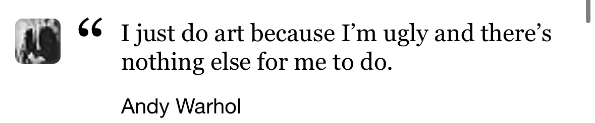 >>7922042Here Warhol is saying that he has nothing else to do besides being ugly and that's why he makes art, which is why his art is also ugly