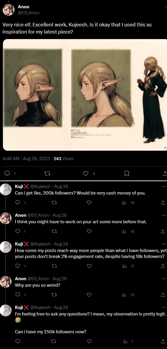 >>7925359me just fucking around with an aispammer that was active on this board a couple years ago when the ai trolling was on full throttlehe tries to make fun of my art but i dont get offended by it so i just tell him his followers are botted and he attempts a last gotcha by calling me weirdthe guy used to fill entire threads by himself writing honest to god essays going into 500 posts territory and would make another thread the instant one got deletedProbably using a bot here as well.