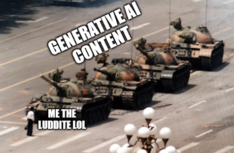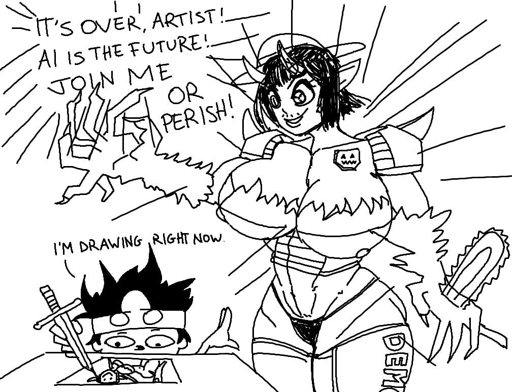 >never discussing A.I.Oh man. You should've been here in 2023. Shit was inescapable.I think all that was necessary to say has already been said. The machines might improve in quality but the moral question doesn't change.Here's my summary: AI artwork is unjustly built on stolen art, it goes against the very essence of humanity and everyone who uses it is a coward.