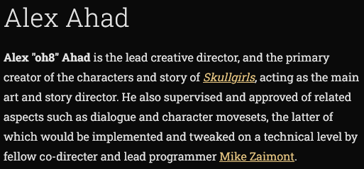 haha you see the joke is that alex ahad hasn't been involved in skullgirls for years due to the hostile takeover by devs who conspired against both him and mikeZ and skullgirls is no longer treated as a product of auteurs but of a product of vague undefined human potential and is now more of a soulless capitalistic product than any ubisoft game could even aspire to be
