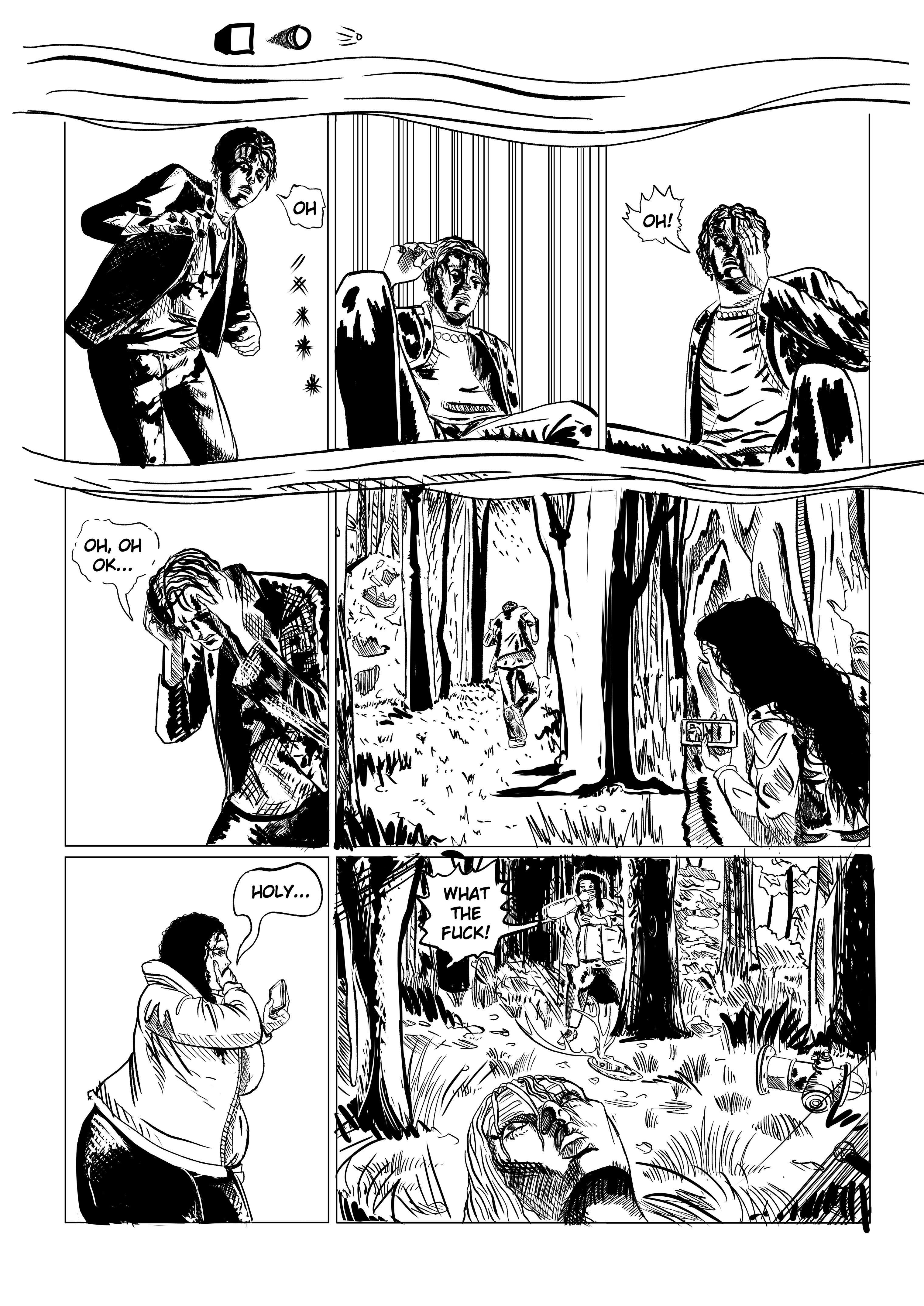 >>7927158I can't go through the whole thing critiquing every panel and page, but I can say that you'd profit from more smaller panels. Take the very first page - it's supposed to be showing our protagonist (I assume) falling off of a really high height, but because of how the two panels are drawn, it shows the before and the after of them slipping off the building, but not the DURING. A small panel of their body sliding or a body part reaching out would be a big help. Also obligatory comment about the rough art - the lines are messy and while that can add to the aesthetic, sometimes it's hard to tell what's what, especially when it's specific, oddly shaped, small objects.Very cool aesthetics, however. Reminds me of Hylics and the art of Serotines.