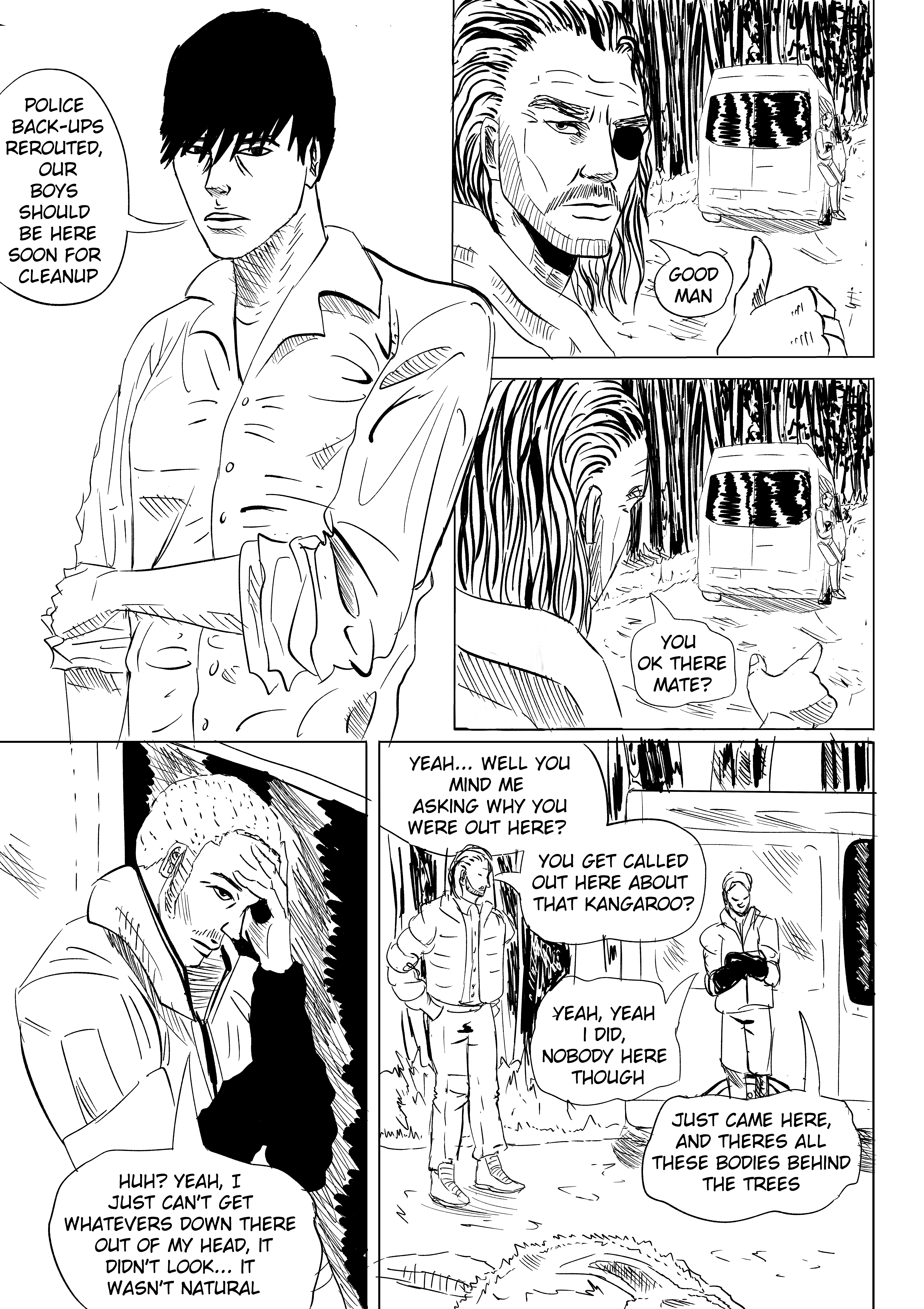 >>7927158>>7927532>part 2his next destination to go to, if yes it does open portal, i want a more obvious transformation of dead bloody corpse turning into portal, if no, i want context of where this portal came from.i can't tell if gnome is calling gun junk or the thing he just exploded junk. its also reading weird he ever 'holstered' the gun. i read it as him tossing it. but he has it later, he summons it or whatever, seems like he tosses it to just pick it up 5 pages later.page 23, is it falling on him, i need a panel of him maybe him being small on the horizon and the big thing plummetingas i said before is page 24 a scene change?my eyes glaze over alittle in the following part, obviously we the viewer aren't meant to have context yet, and you get very surreal, my only comment is. with such otherworldly concepts i think you really REALLY need to push the absurdity.31- does the gnome travel far to find the bug girl? all the headless things are point at him, as far as the horizon goes, but when he meets her, they are facing her. maybe an extreme long shot with these things as far as the eye can see, and him traveling through it, as he notices the clues.back to us without context: 34- i dont know why he spares the bug, but i think there should be more emphasis on her lil sympathetic eyes, the story should slow here. just for a page or two, it feels like it wants to be more climactic not just a corner panel.he tosses the gun again, if he had it the whole time it would be more impactful when he discards it here.35- he obviously realises or discovers something. even if we dont get to know why yet, i want there to be a clue, as it reads now he is kinda just an agent of chaos meandering through the weird world, could he say something that can hook us to why his business is only NOW over?37- panel 4 and 5 (the bug girl) could be compressed. it reads alittle disjointed because of the layout, it seems to sequential.