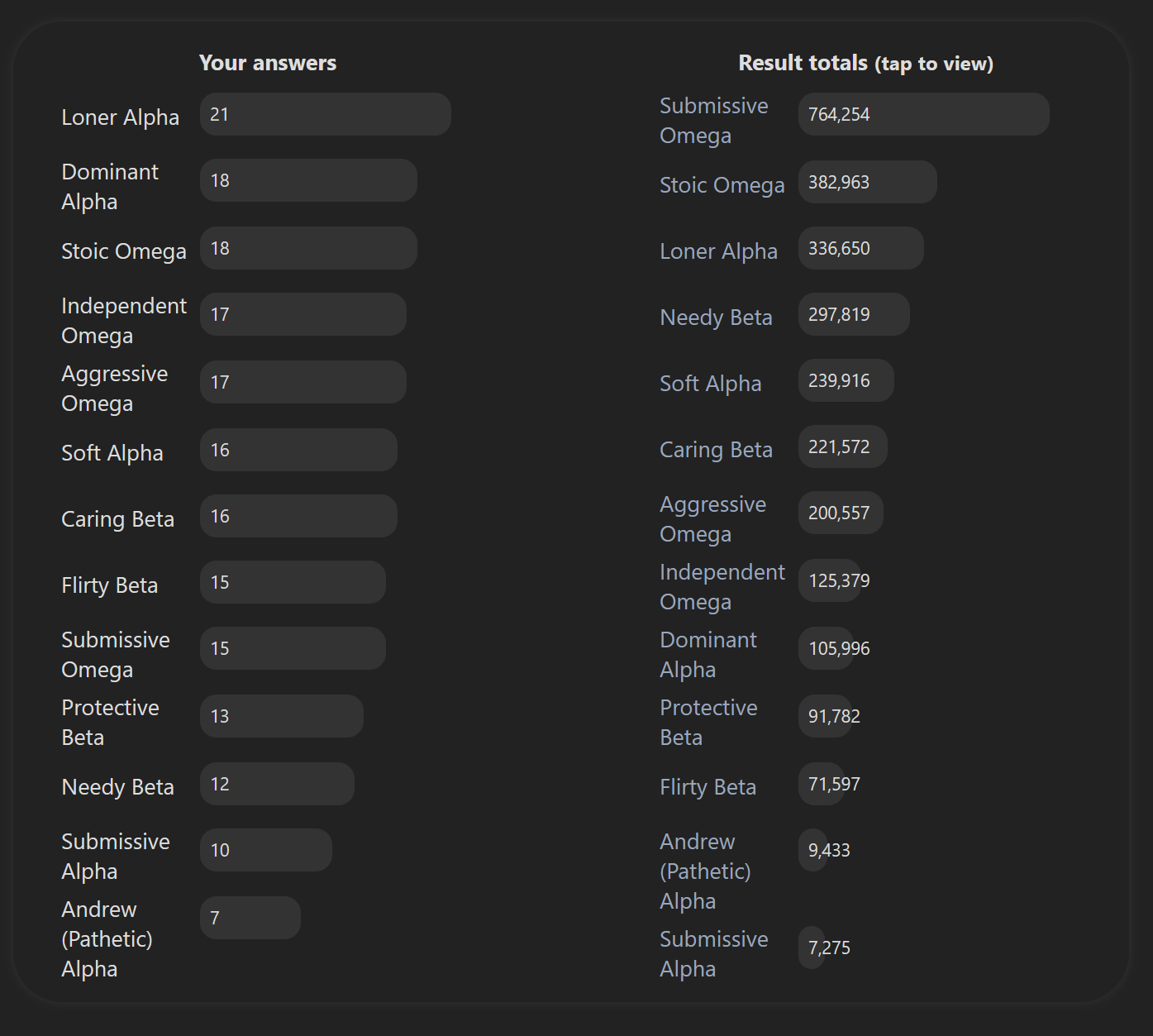 >>218192126I misread one of the questions, I retook it and got Loner Alpha.